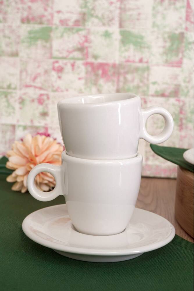 - Modern tasarımıyla dikkat çeken 2'li porselen espresso takımı, kahve keyfinizi şık bir şekilde tamamlar.; - Her bir fincan 90 ml hacmiyle ideal espresso servisi için uygundur.; - 4 parçadan oluşan set, 2 kişilik kullanım için tasarlanmıştır ve her bir fincan çift kişilik keyif sunar.; - Yüksek kaliteli porselen materyali sayesinde uzun ömürlü ve dayanıklıdır.; - Bulaşık makinesinde güvenle yıkanabilir olması, temizlik ve bakım kolaylığı sağlar.; - Beyaz rengiyle zarif ve sade bir görünüm sunar; her türlü mutfak dekorasyonuyla uyum sağlar.; - Gıda temasında güvenli kullanım için uygun semboller taşır; sağlığınız düşünülerek üretilmiştir.; - Türk menşeli olmasıyla yerel üretim kalitesini evinizde hissedin.