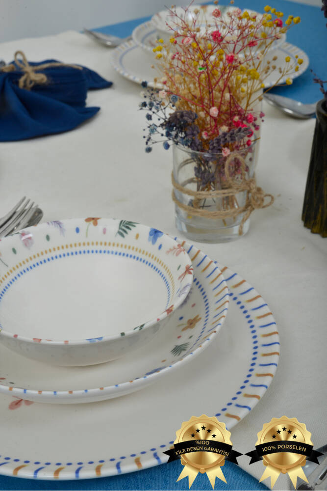 - 18 parça geniş kapasiteye sahip, 6 kişilik porselen yemek takımı ile aile yemeklerinizde şıklığı ve konforu bir arada sunar.; - Yuvarlak şekliyle klasik ve zamansız bir tasarıma sahip olan bu set, her türlü sofra düzenine kolayca uyum sağlar.; - Yüksek kaliteli porselen malzemesi sayesinde uzun ömürlü kullanım vaat ederken, bulaşık makinesinde rahatlıkla yıkanabilir olması pratiklik kazandırır.; - Modern tema ve stil anlayışına uygun olarak tasarlanmış olup, çağdaş dekorasyon trendleriyle mükemmel uyumu yakalar