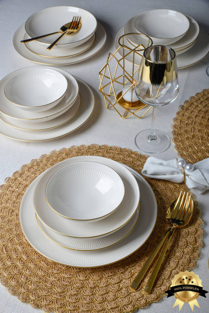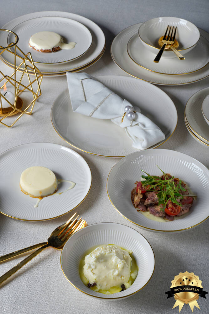 - 6 kişilik geniş kapasite, aile ve arkadaşlarınızla keyifli sofralar için ideal.; - 24 parçadan oluşan set, her türlü yemek deneyiminizi tamamlar.; - Bulaşık makinesinde kolayca yıkanabilme özelliği ile pratik kullanım sunar.; - Modern tasarımıyla mutfak dekorasyonunuza şıklık katar.; - Yüksek kaliteli porselen malzemesi sayesinde uzun ömürlü ve dayanıklı kullanım sağlar.; - Yuvarlak şekliyle klasik ve zamansız bir görünüm sergiler.; - Türk menşeli olmasıyla yerel zevklere uygun tasarım anlayışını yansıtır.; - Beyaz rengin zarafetiyle her türlü masa düzenine uyum sağlar.