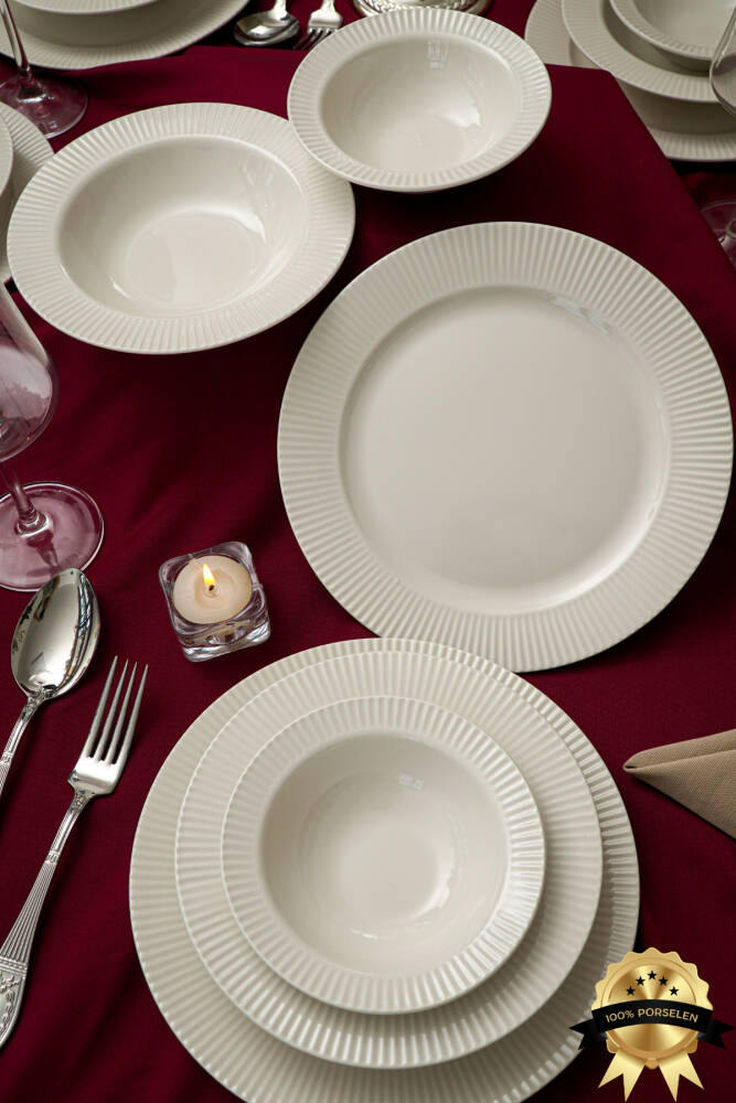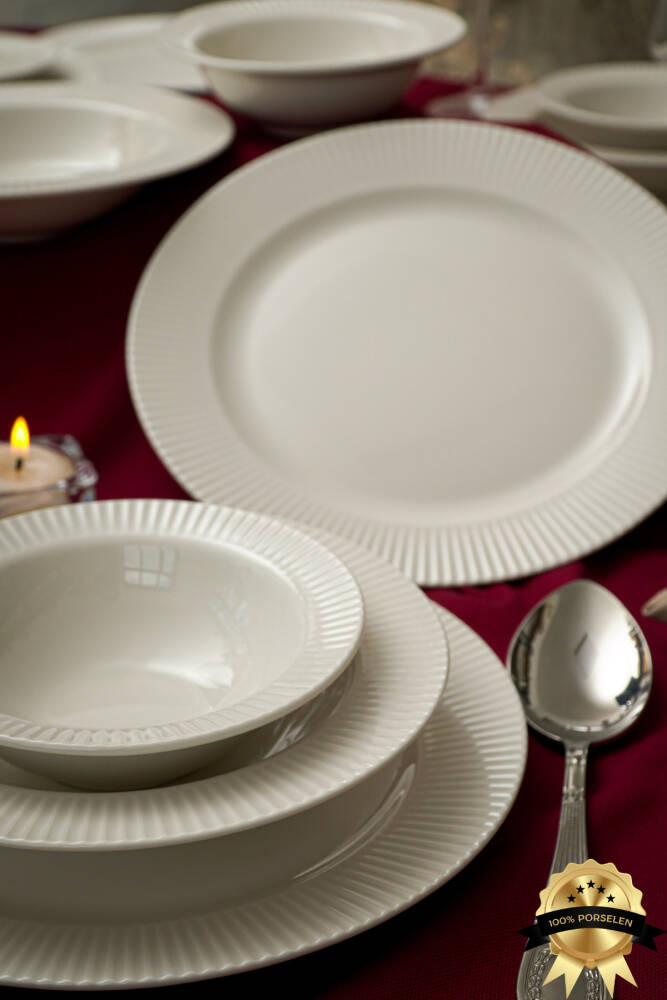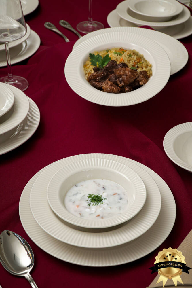 Evinizin yemek masasını şıklıkla donatın! ; Elif 18 Parça Porselen Yemek Takımı, zarif tasarımı ve dayanıklı malzemesiyle öne çıkıyor. ; Hem günlük kullanıma uygun, hem de özel davetlerde masanıza zarafet katıyor. ; Ürün İçeriği: ; 25cm Servis*6 adet ; 19cm Çukur*6 adet ; 14cm Kase*6 adet ; Kaliteli porselen malzemeden üretilmiştir, uzun ömürlü ve dayanıklıdır. Mikrodalga fırına ve bulaşık makinesine uyumludur, kullanımı pratiktir. Zarif ve modern tasarımıyla her türlü sofra düzenine uyum sağlar. ; Siparişleriniz, strafor ve özel kutular kullanılarak özenle paketlenip gönderilmektedir. ;