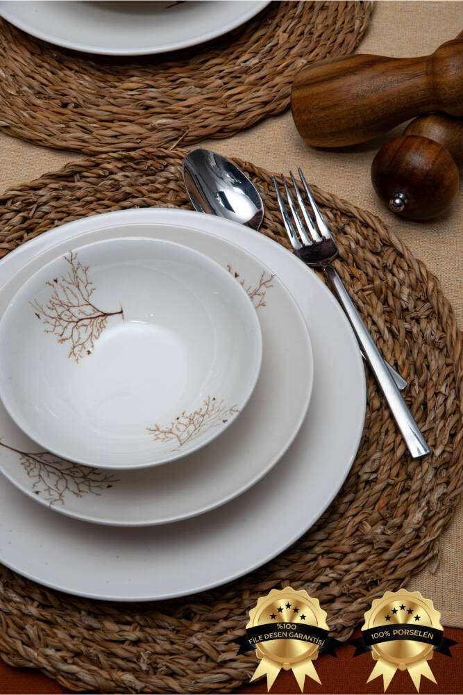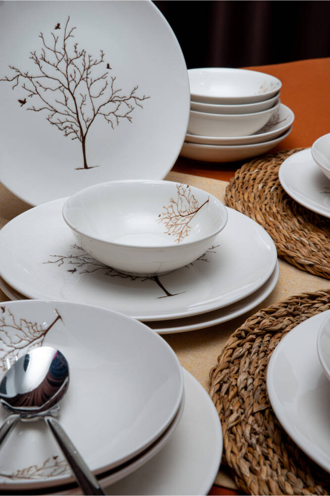 Doğa ilhamlı tasarımı ve detaylı Hayat Ağacı motifleriyle dikkat çeken bu yemek takımı, 6 kişilik yapısıyla her yemeği özel bir deneyime dönüştürür. ; Kaliteli porselen malzemesi, dayanıklılığı ve estetik sunumu garanti eder. ; Porselen Rengi : Kırık Beyaz ; 6 Adet 25 cm Servis Tabağı ; 6 Adet 19 cm Çukur Tabak ; 6 Adet 14 cm Kase ; Siparişleriniz, strafor ve özel kutular kullanılarak özenle paketlenip gönderilmektedir. ;