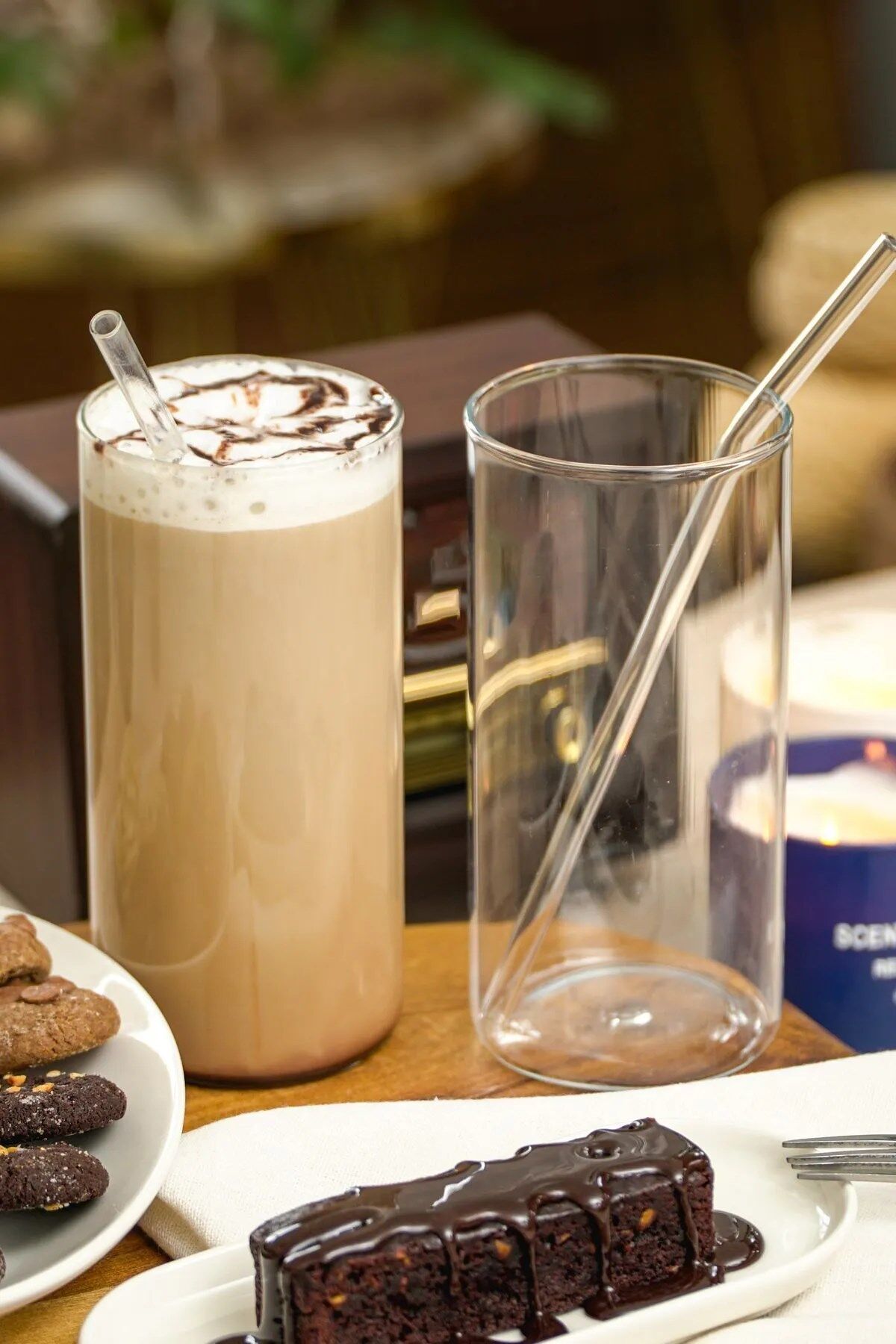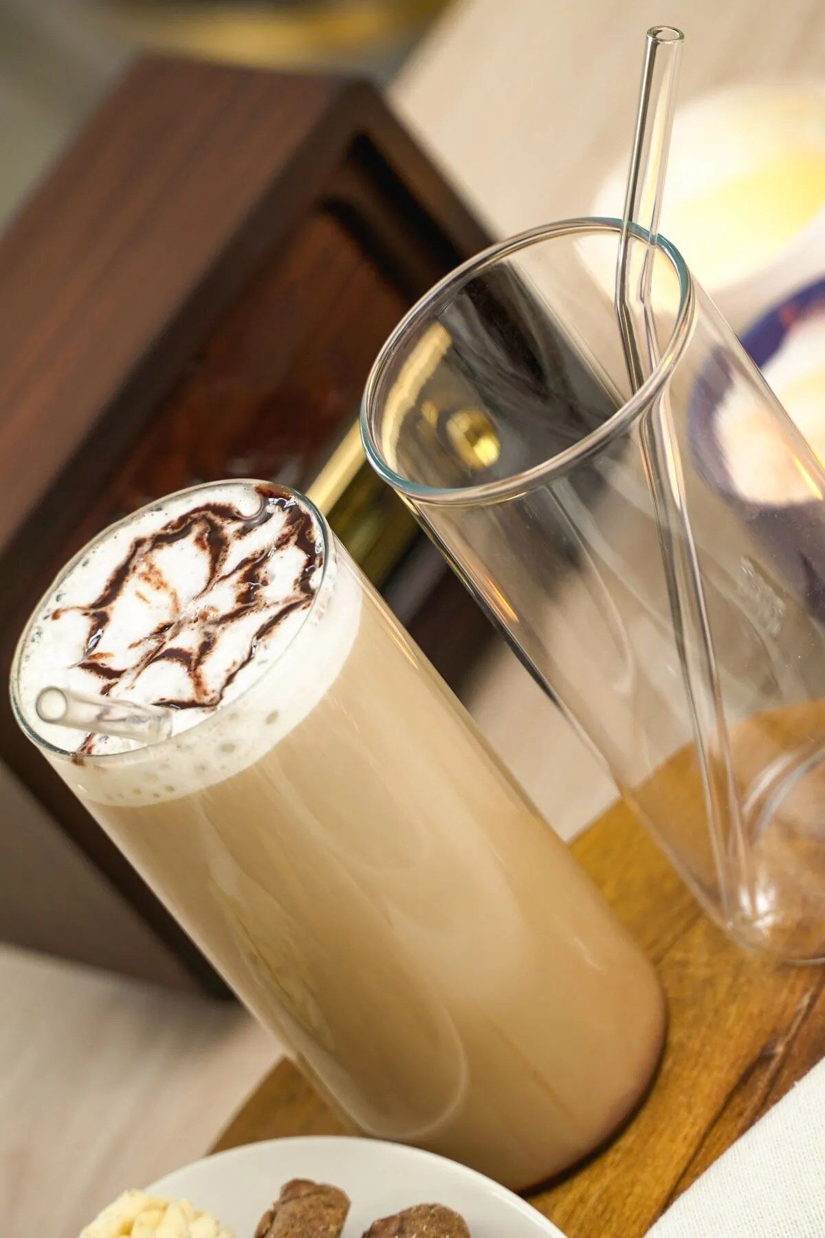 2'li 550 ml Modern Tasarımlı Pipetli Cam Bardak - Şık Soğuk Limonata Meşrubat Bardağı