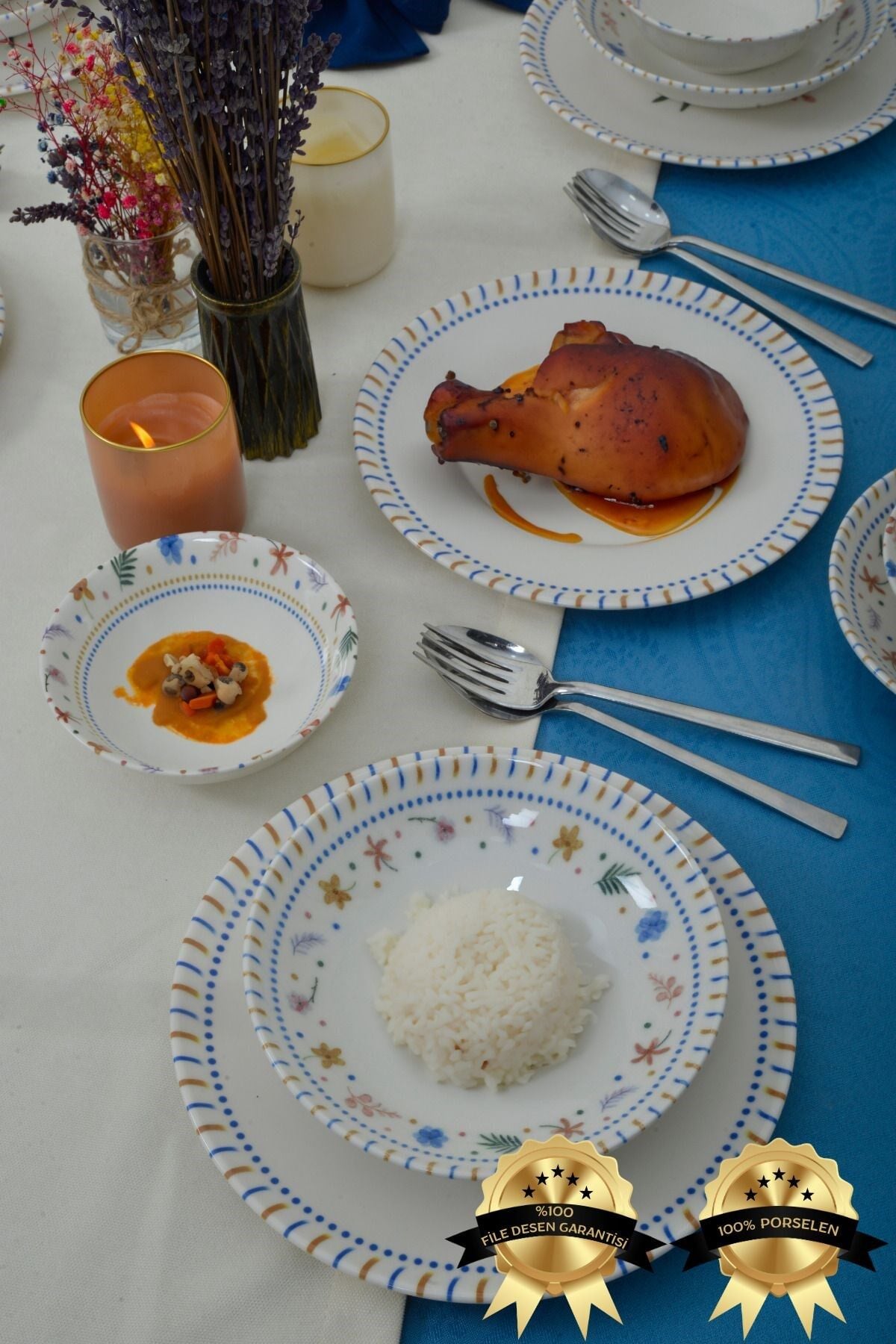 - 18 parça geniş kapasiteye sahip, 6 kişilik porselen yemek takımı ile aile yemeklerinizde şıklığı ve konforu bir arada sunar.; - Yuvarlak şekliyle klasik ve zamansız bir tasarıma sahip olan bu set, her türlü sofra düzenine kolayca uyum sağlar.; - Yüksek kaliteli porselen malzemesi sayesinde uzun ömürlü kullanım vaat ederken, bulaşık makinesinde rahatlıkla yıkanabilir olması pratiklik kazandırır.; - Modern tema ve stil anlayışına uygun olarak tasarlanmış olup, çağdaş dekorasyon trendleriyle mükemmel uyumu yakalar