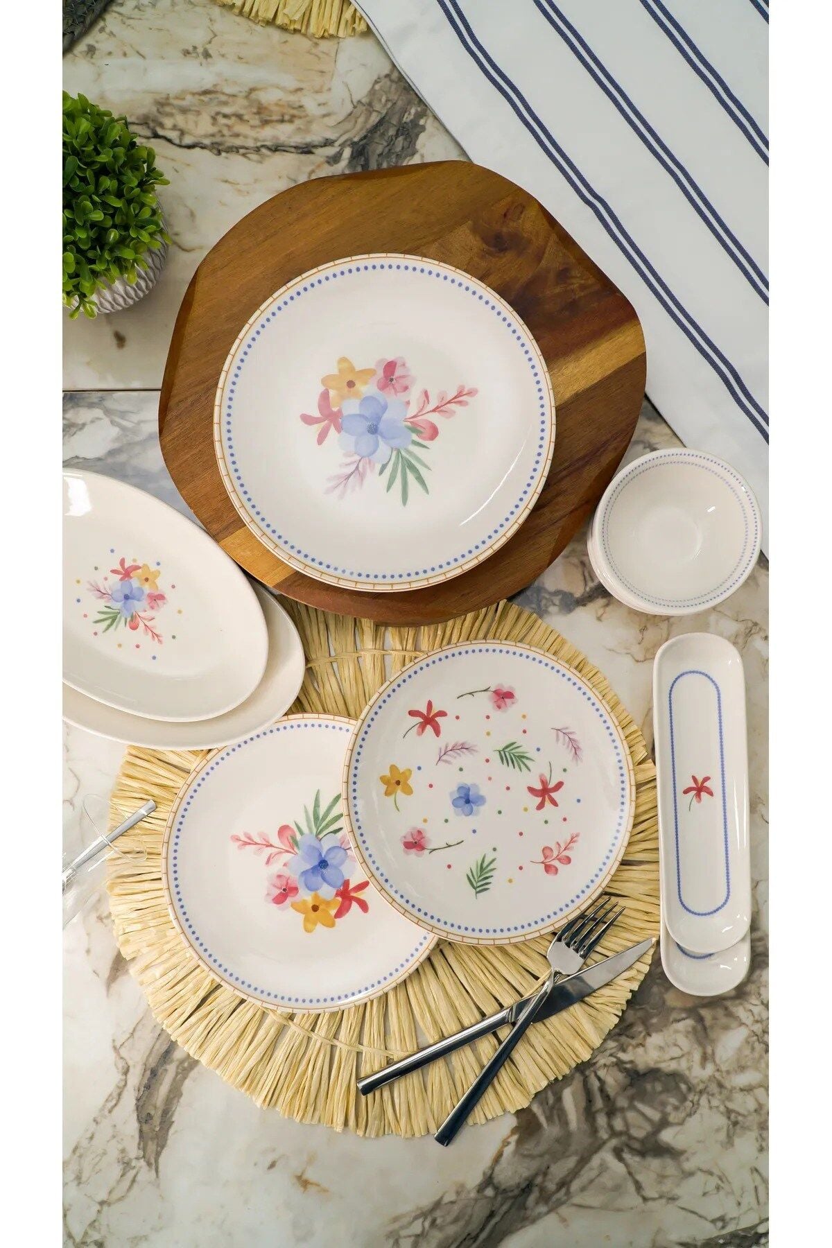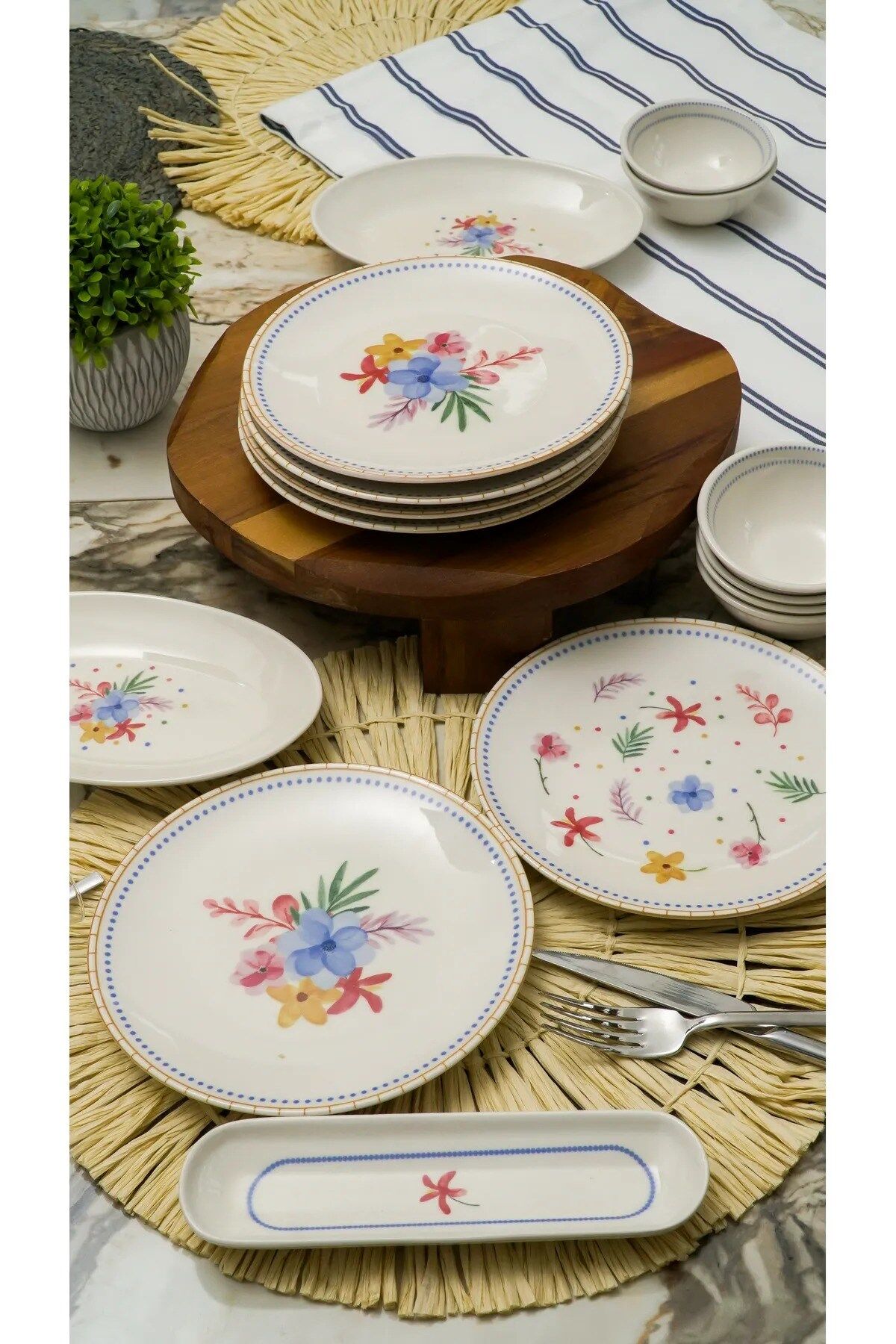 Dalya 16 parça 6 kişilik kahvaltı takımı Özenli tasarımı ve şık duruşuyla kahvaltılarınızın vazgeçilmezi olacak. Porselen malzemeden üretilen takım, dayanıklı ve uzun ömürlü kullanım sunar. Ürün özellikleri ; 6 adet servis tabağı (20 cm) ; ; 2 adet kayık tabak (20x13 cm) ; ; 6 adet reçellik (10 cm) ; ; 2 adet zeytinlik (20 cm) ; ; Kullanım bilgileri ; Bulaşık makinesinde yıkanabilir. ; ; Mikrodalga fırında kullanılabilir. ; ;