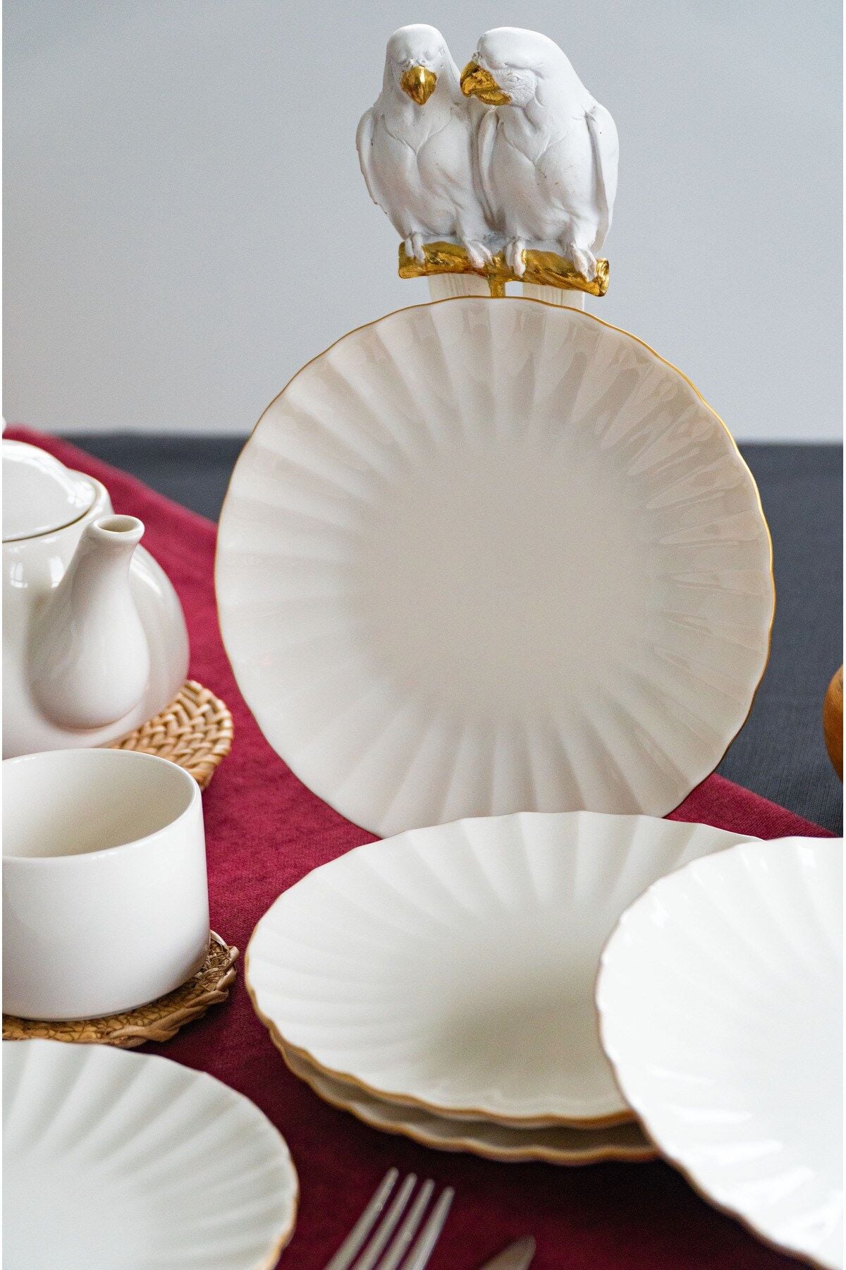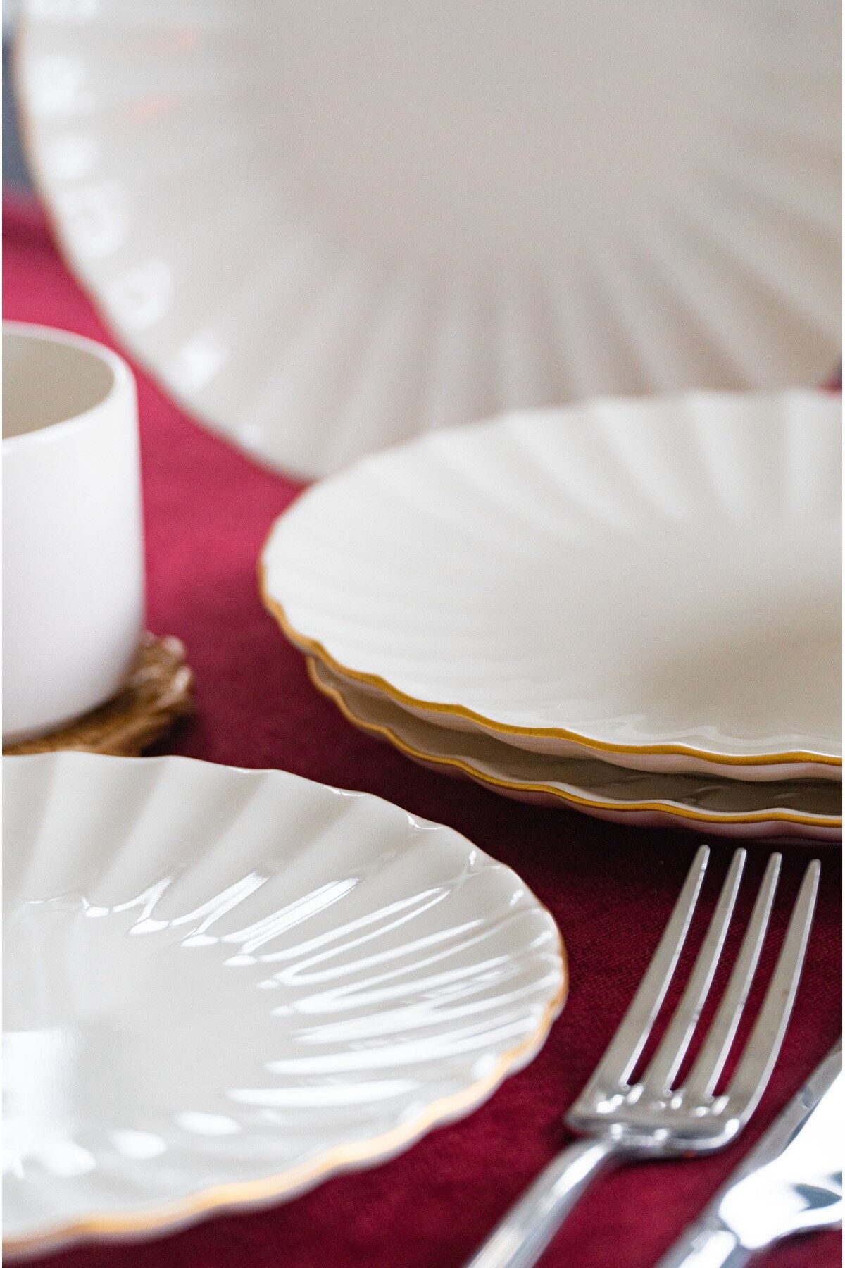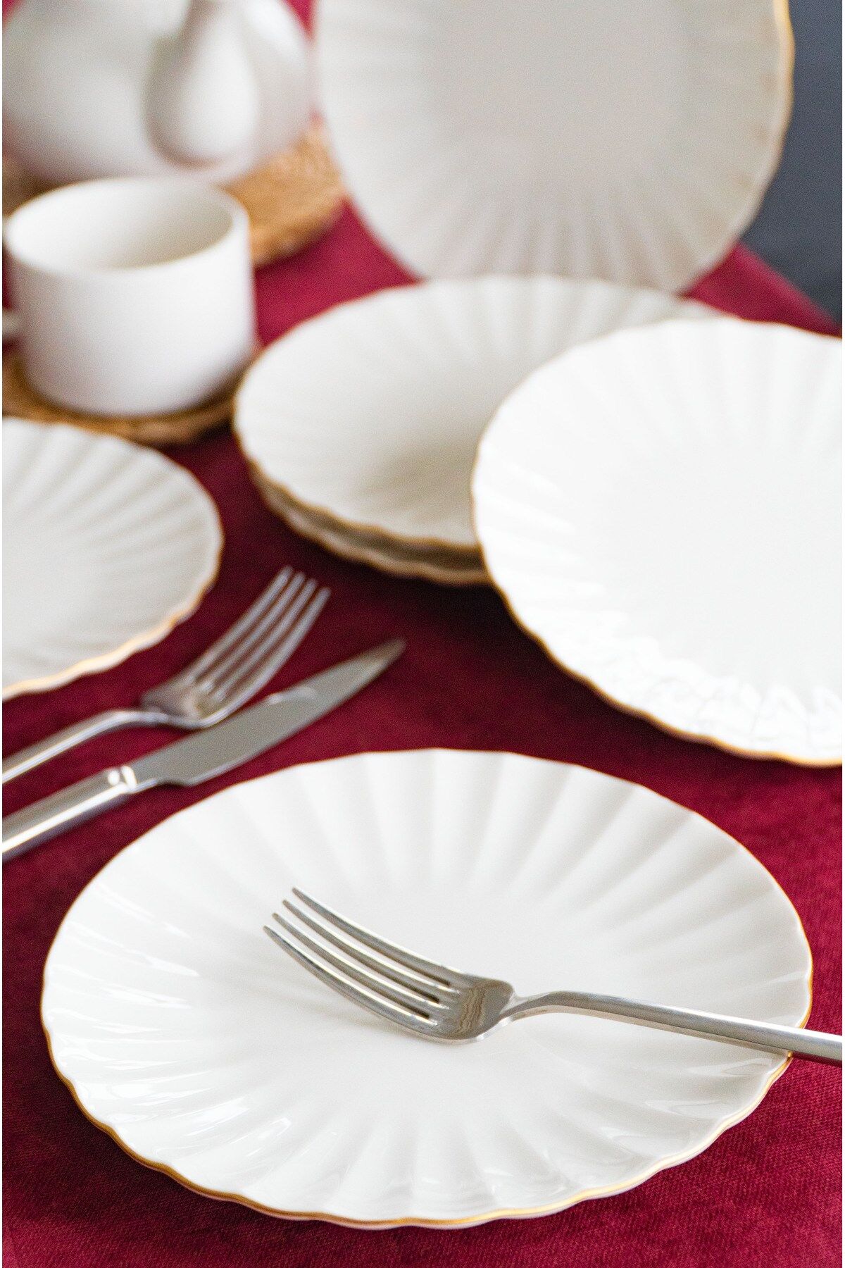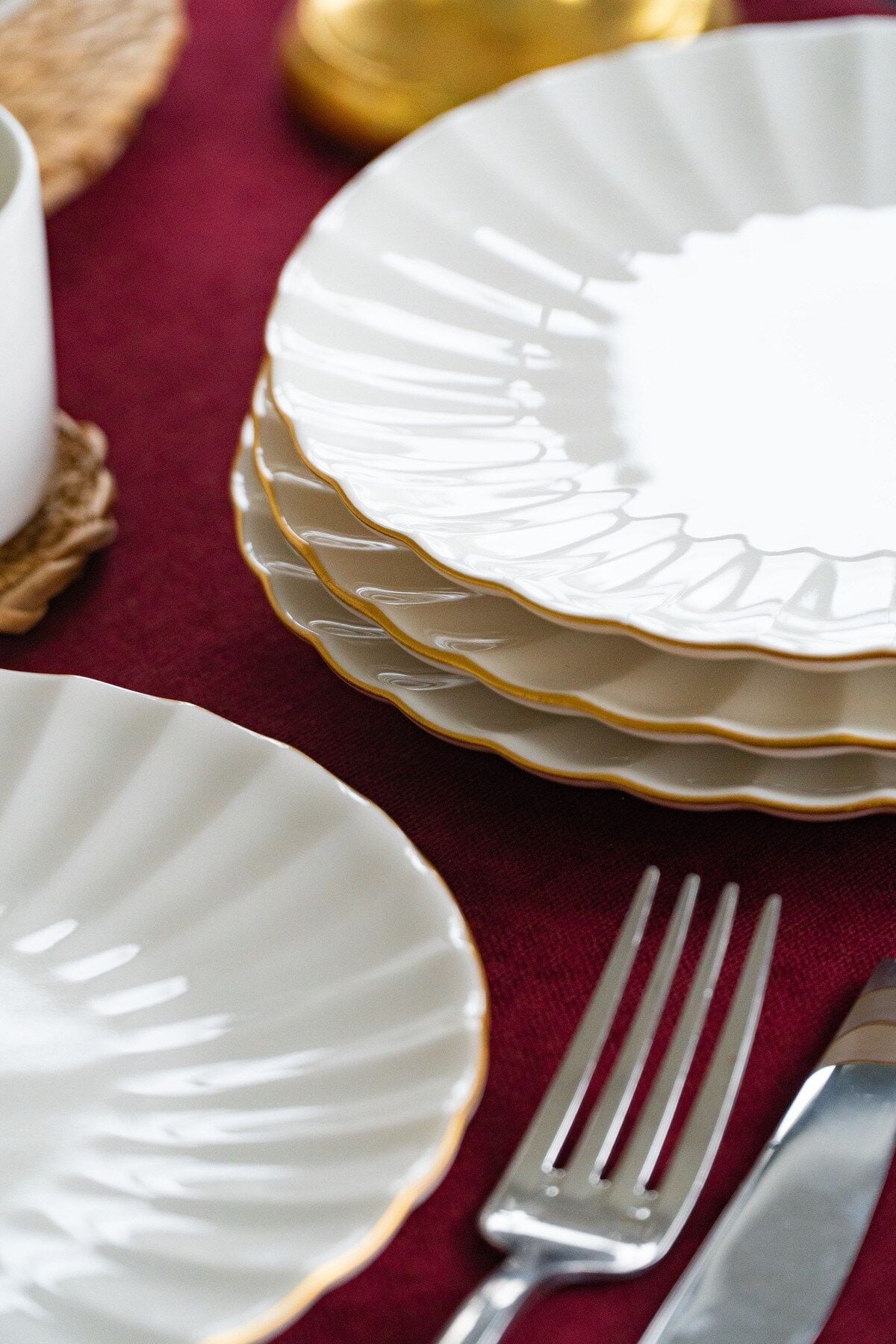 - Altın yaldız detaylarıyla zenginleştirilmiş, modern ve şık bir tasarıma sahip.; - 20 cm çapındaki yuvarlak formuyla her türlü pasta ve tatlıyı sergilemek için ideal.; - Gıda ile temasa uygun güvenli malzemeden üretilmiştir, BPA içermez.; - Porselen materyali sayesinde dayanıklılık ve uzun ömürlü kullanım sunar.; - Elde yıkama önerisiyle, ürünün estetiğini koruyarak kolay temizlik sağlar.; - 6 parçalık set halinde sunularak, misafirlerinize özel davetlerinizde şıklığı tamamlar.; - Türkiye'de üretilmiş olup, yerel üretim kalitesini sofralarınıza taşır.;