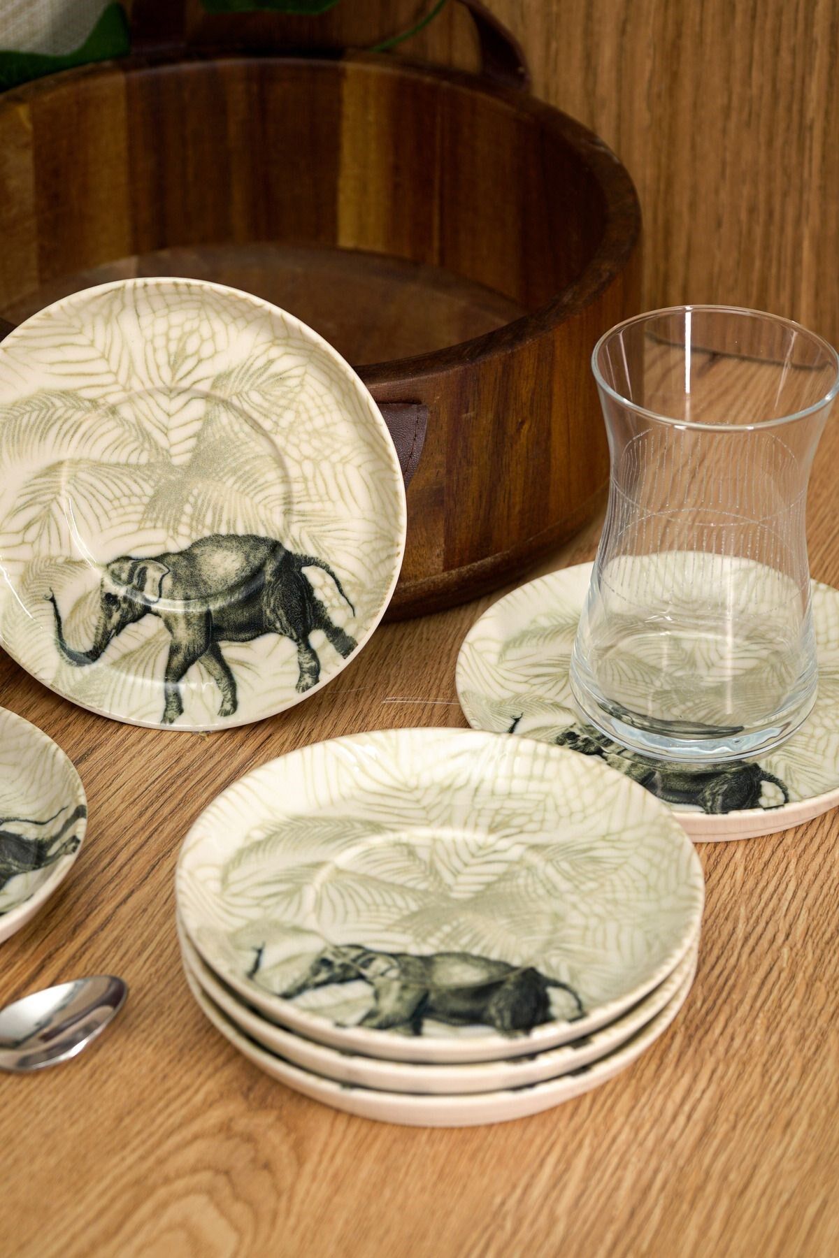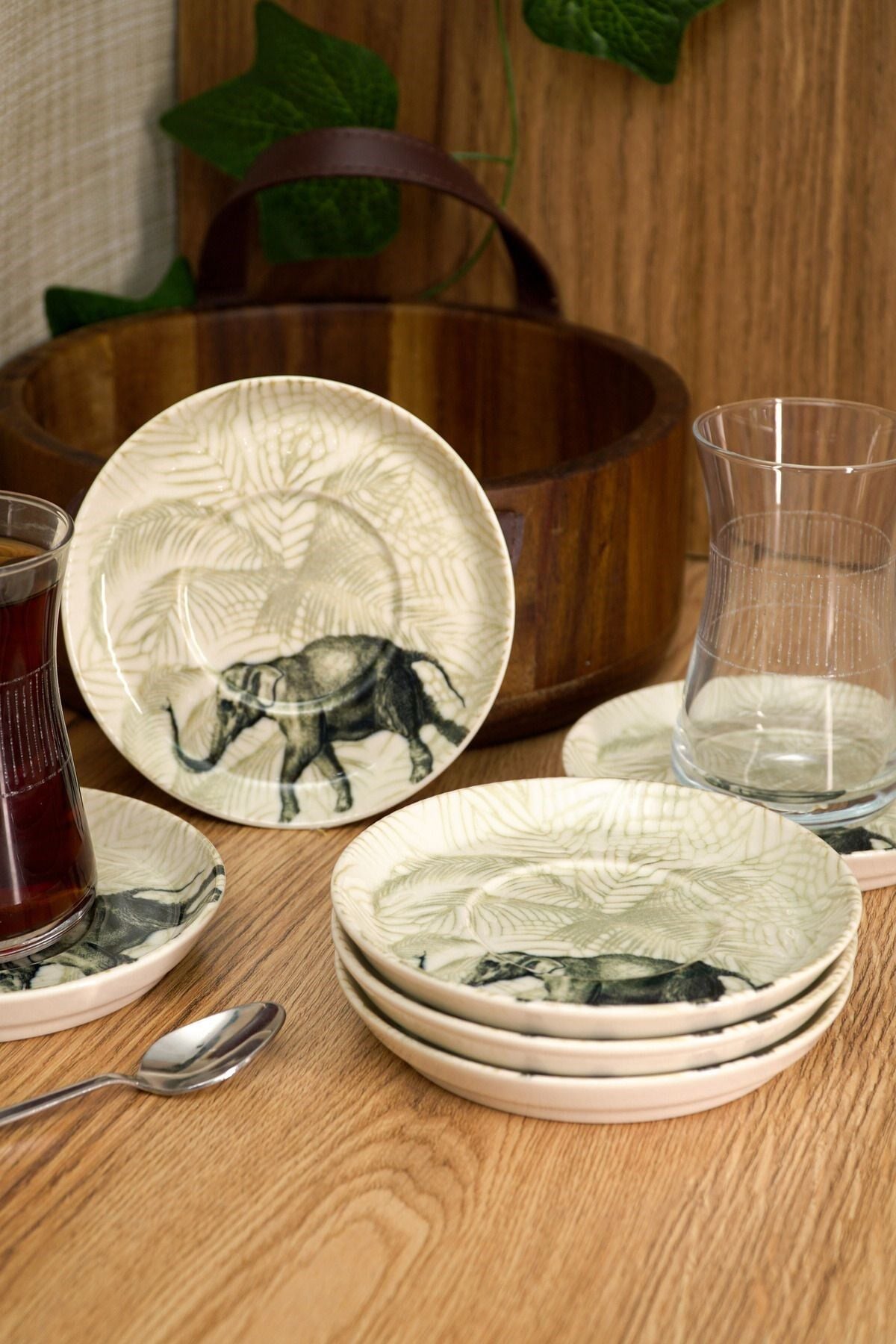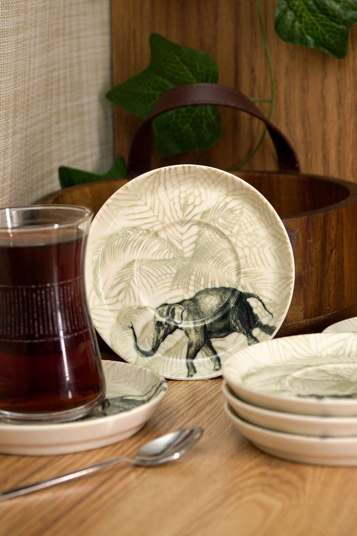 Fil desenleriyle süslenmiş bu zarif çay tabakları, her çay sunumuna şıklık katacak. Kırık beyaz rengi ve dayanıklı yapısıyla öne çıkan bu set, çay saatlerinizi daha özel kılacak. ; Porselen Rengi : Kırık Beyaz Bardak ; Oturtma çapı 6 cm ; 6 Adet 13 cm Çay Tabağı ;