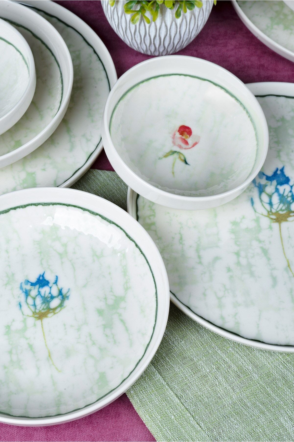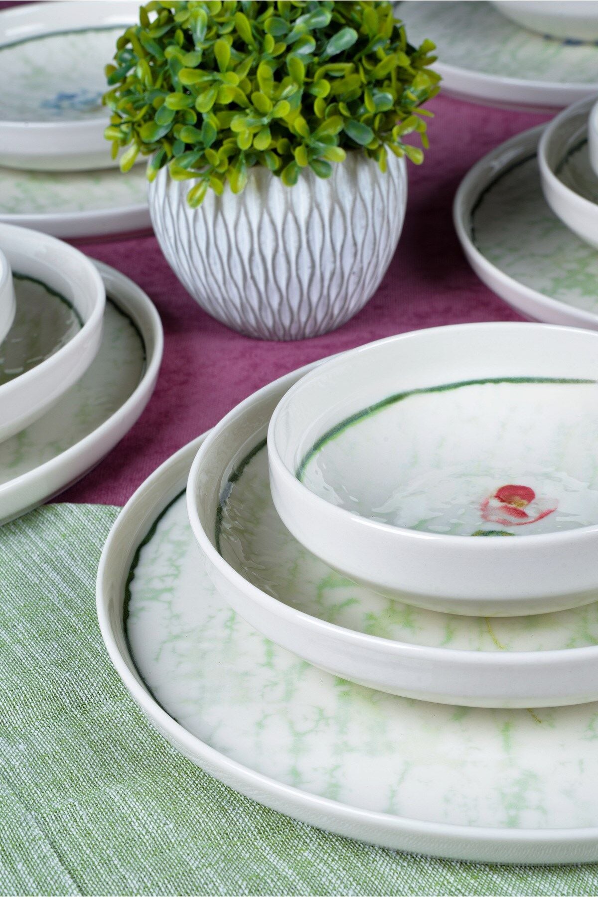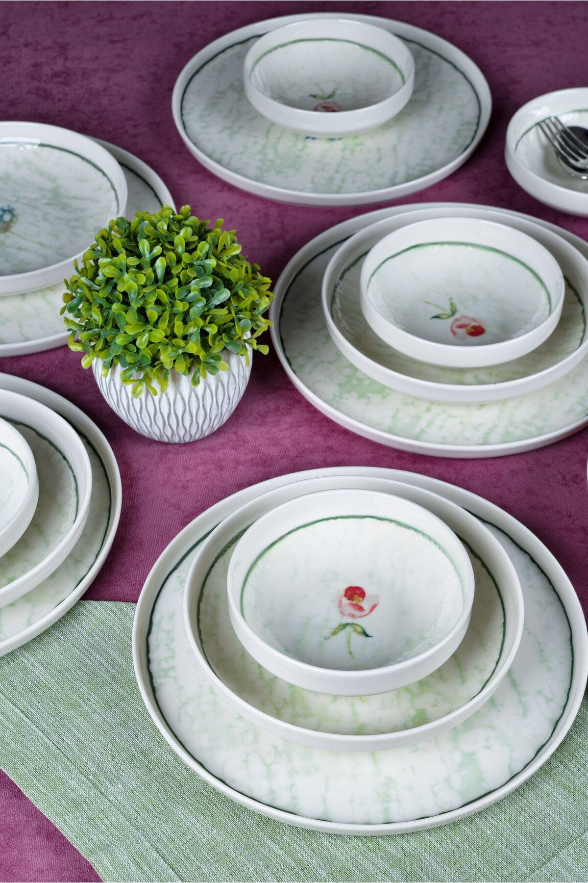 - Modern tasarımıyla dikkat çeken Ebrusu 18 Parça 6 Kişilik Porselen Yemek Takımı, beyaz renk seçeneğiyle şıklığı sofralarınıza taşır.; - Yuvarlak şekilli tabakları ve kaseleri ile yemeklerinizi estetik bir sunumla karşılar.; - 6 kişilik geniş kapasitesi sayesinde aile yemeklerinden özel davetlere kadar her türlü toplantıda rahatlıkla kullanılabilir.; - Elde yıkama özelliği sayesinde, porselen malzemesinin hassas yapısını koruyarak uzun ömürlü kullanım sunar.; - Beyaz web rengi ile her türlü masa örtüsü ve dekorasyonla kolayca uyum sağlar.; - Türkiye menşeli olmasıyla kalite ve güvenilirliği garanti eder.; - Ebrusu Yemek Takımı, geleneksel ebru deseninin modern porselen dokusuyla buluştuğu özel bir tasarım koleksiyonudur.; Her parçadaki yeşil tonlar, su üzerinde dans eden ebru damarlarını andırarak sofranıza sakin, ferah ve doğal bir estetik katar.; Takımın merkezindeki zarif çiçek dokunuşu ise bu sadeliğe romantik bir detay ekleyerek hem günlük kullanımda hem misafir sofralarında şık bir atmosfer oluşturur.; %100 porselenden üretilen Ebrusu, uzun ömürlü yapısı, pürüzsüz yüzeyi ve hafifliğiyle hem kullanışlı hem de dayanıklıdır.; Yemek, sunum ve servis anlarınızı daha keyifli hale getiren bu takım; renk geçişleri, ince kontur çizgisi ve yumuşak formlarıyla sofranızda doğal bir ahenk yaratır.; Zarafet, doğallık ve geleneksel dokunun modern yorumu…Ebrusu Yemek Takımı ile sofralarınız artık daha sanatsal, daha özel.