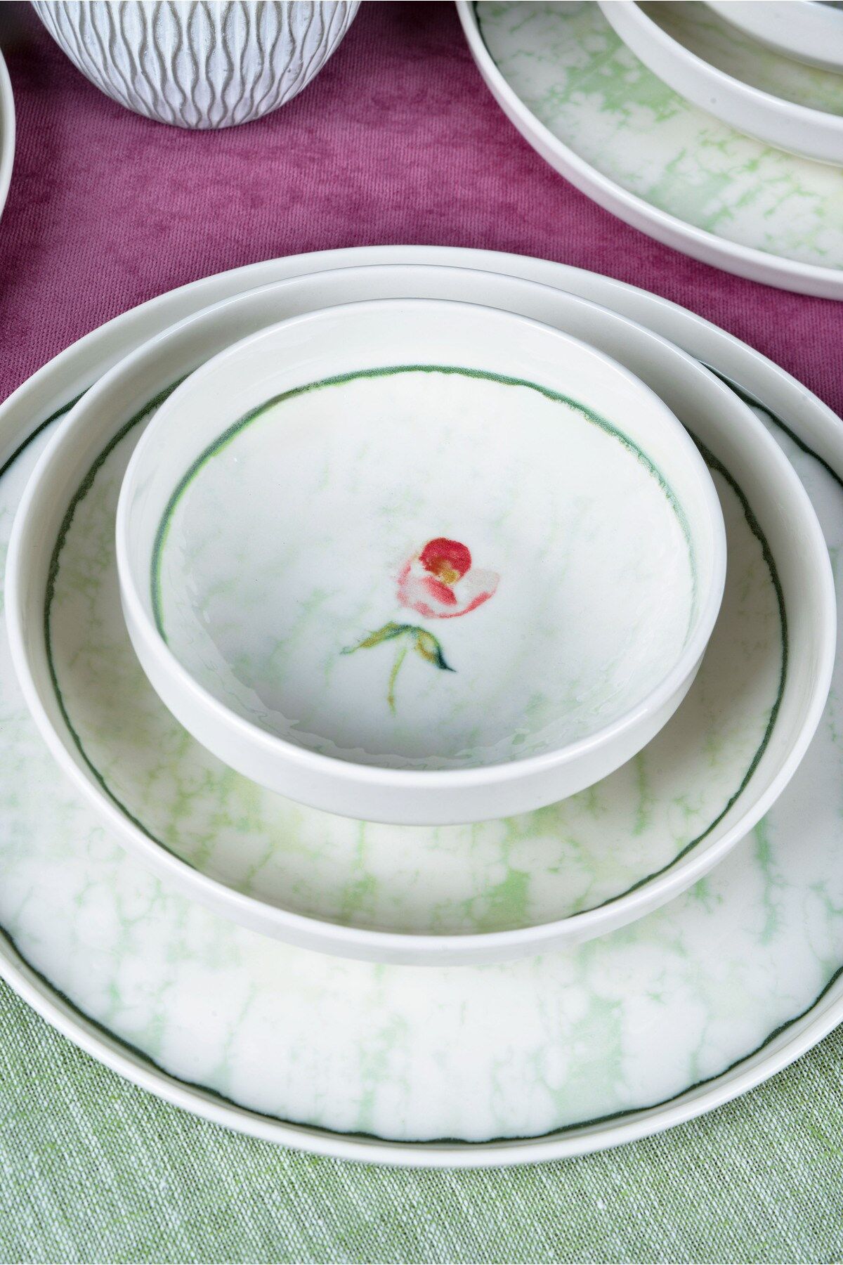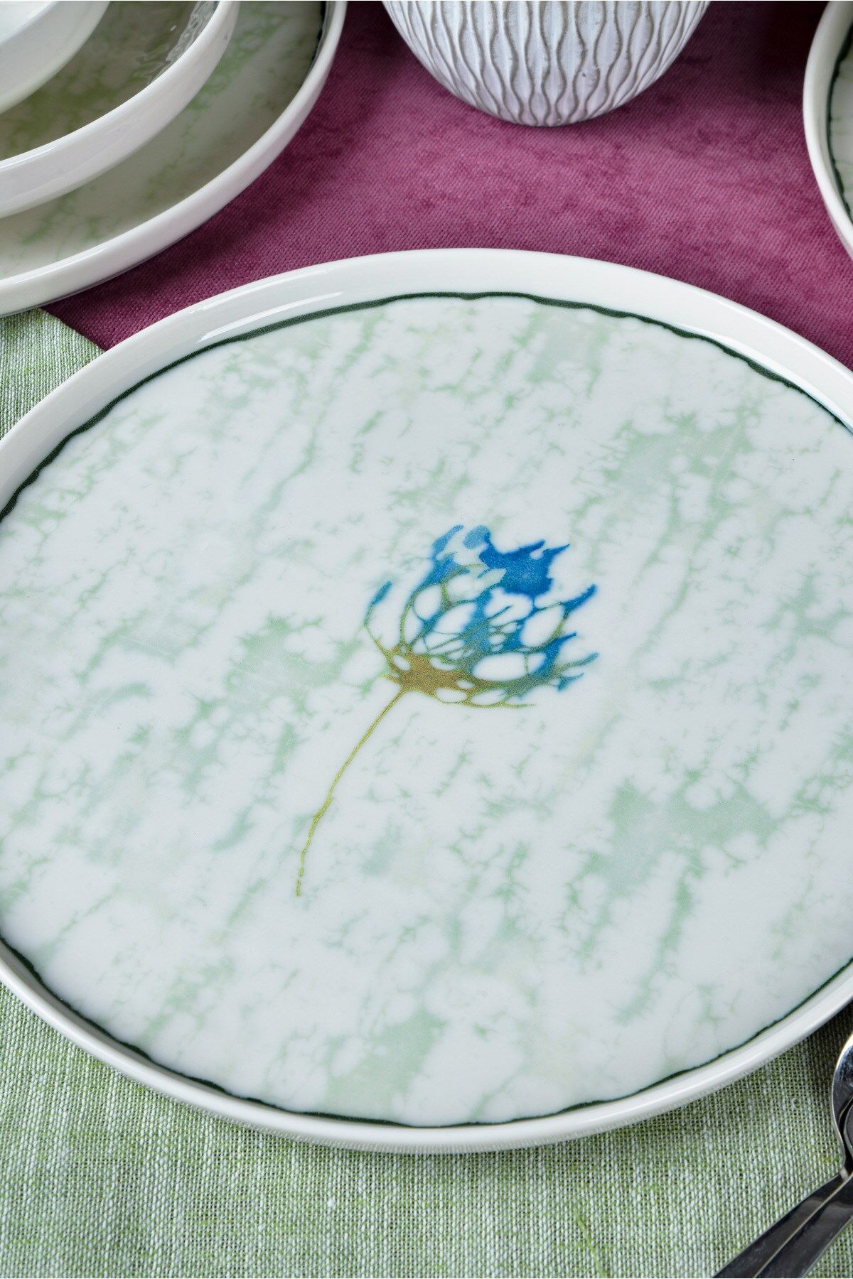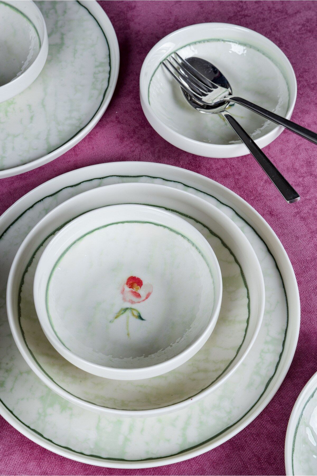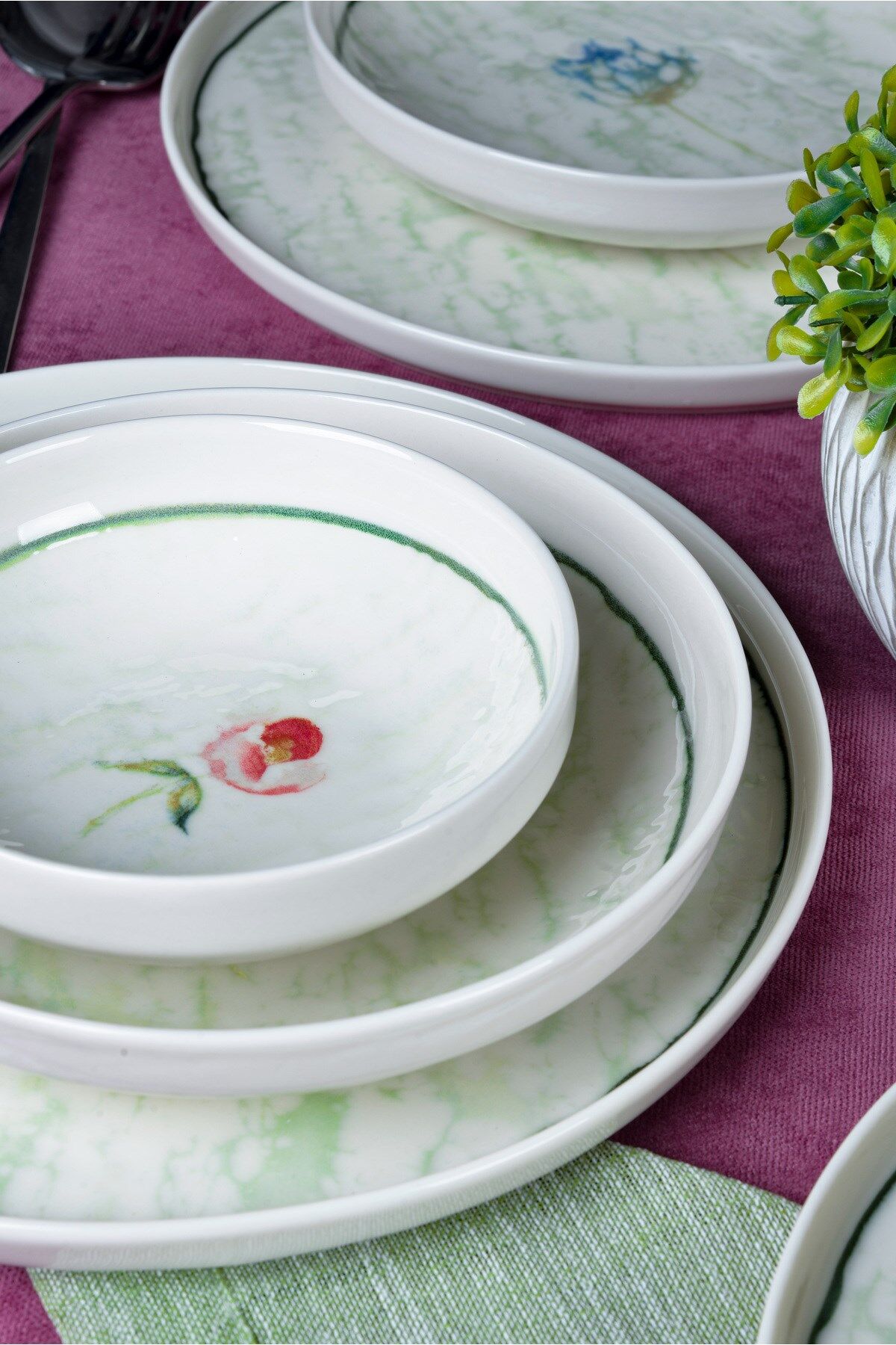 - Modern tasarımıyla dikkat çeken Ebrusu 18 Parça 6 Kişilik Porselen Yemek Takımı, beyaz renk seçeneğiyle şıklığı sofralarınıza taşır.; - Yuvarlak şekilli tabakları ve kaseleri ile yemeklerinizi estetik bir sunumla karşılar.; - 6 kişilik geniş kapasitesi sayesinde aile yemeklerinden özel davetlere kadar her türlü toplantıda rahatlıkla kullanılabilir.; - Elde yıkama özelliği sayesinde, porselen malzemesinin hassas yapısını koruyarak uzun ömürlü kullanım sunar.; - Beyaz web rengi ile her türlü masa örtüsü ve dekorasyonla kolayca uyum sağlar.; - Türkiye menşeli olmasıyla kalite ve güvenilirliği garanti eder.; - Ebrusu Yemek Takımı, geleneksel ebru deseninin modern porselen dokusuyla buluştuğu özel bir tasarım koleksiyonudur.; Her parçadaki yeşil tonlar, su üzerinde dans eden ebru damarlarını andırarak sofranıza sakin, ferah ve doğal bir estetik katar.; Takımın merkezindeki zarif çiçek dokunuşu ise bu sadeliğe romantik bir detay ekleyerek hem günlük kullanımda hem misafir sofralarında şık bir atmosfer oluşturur.; %100 porselenden üretilen Ebrusu, uzun ömürlü yapısı, pürüzsüz yüzeyi ve hafifliğiyle hem kullanışlı hem de dayanıklıdır.; Yemek, sunum ve servis anlarınızı daha keyifli hale getiren bu takım; renk geçişleri, ince kontur çizgisi ve yumuşak formlarıyla sofranızda doğal bir ahenk yaratır.; Zarafet, doğallık ve geleneksel dokunun modern yorumu…Ebrusu Yemek Takımı ile sofralarınız artık daha sanatsal, daha özel.