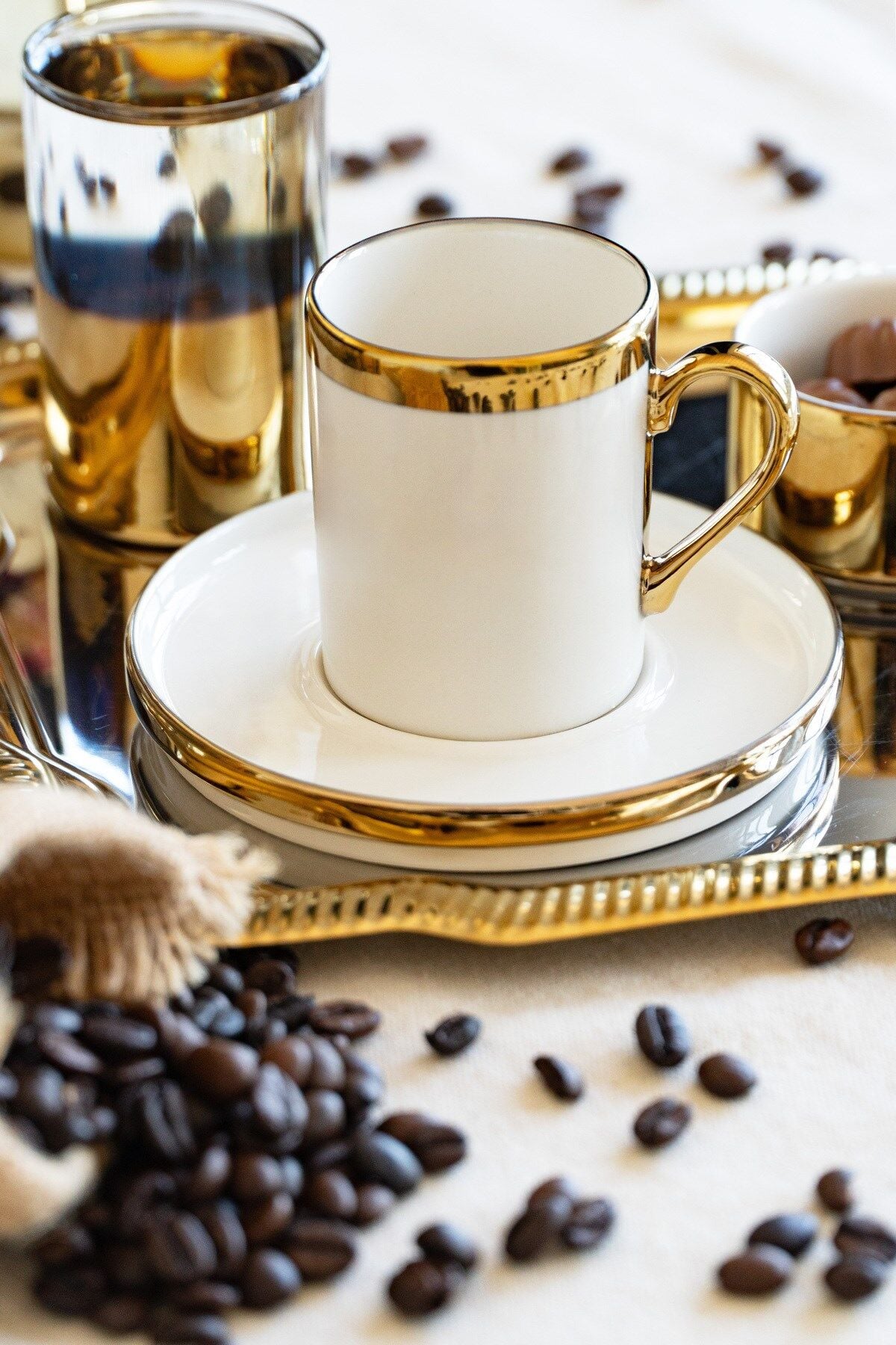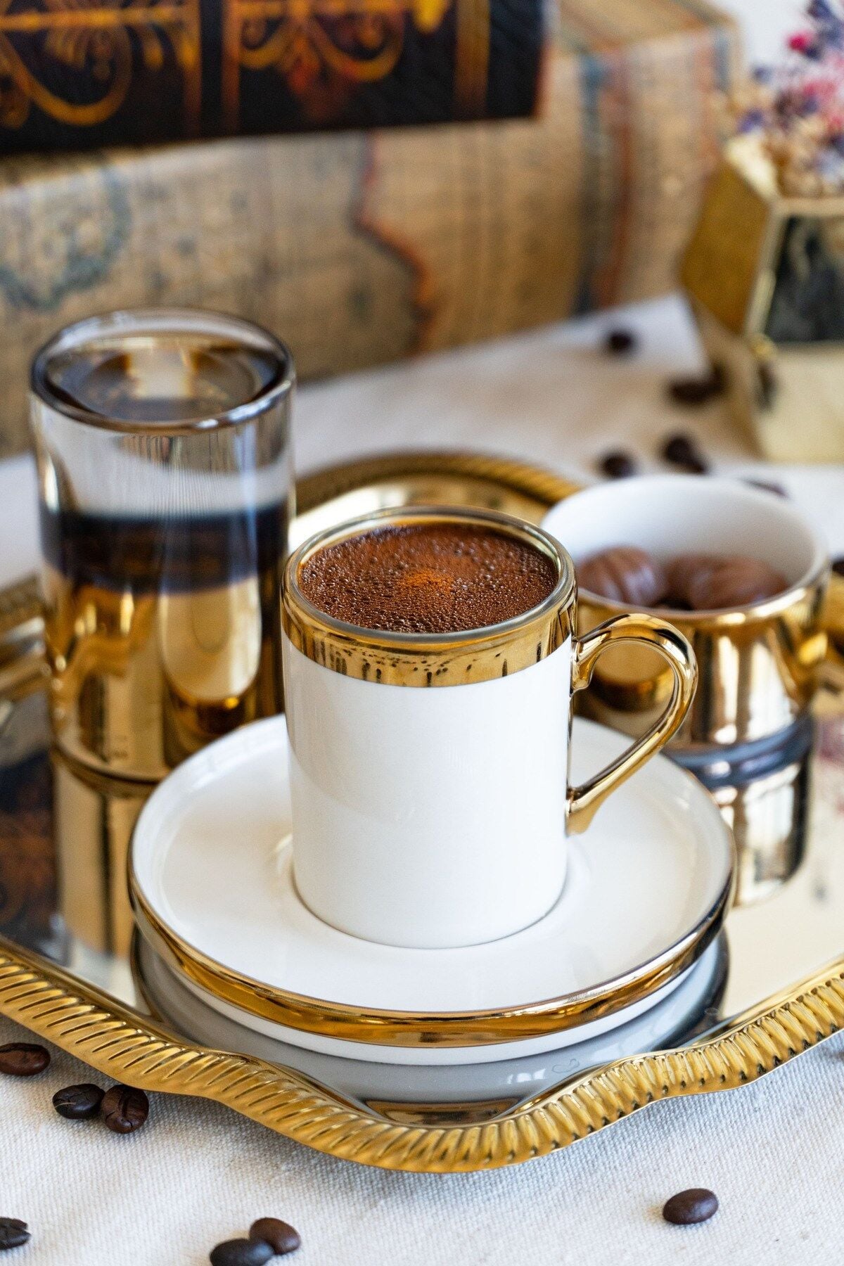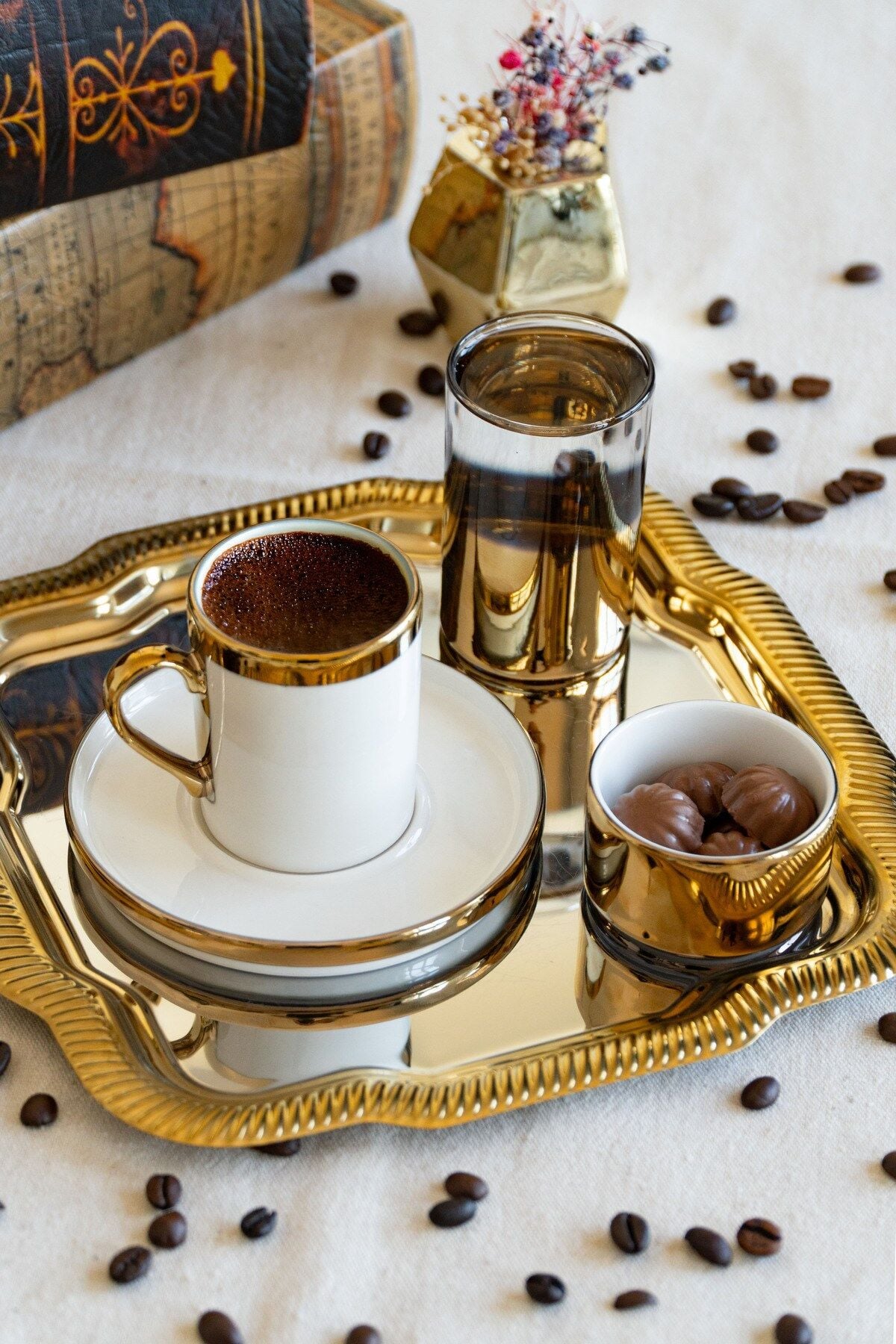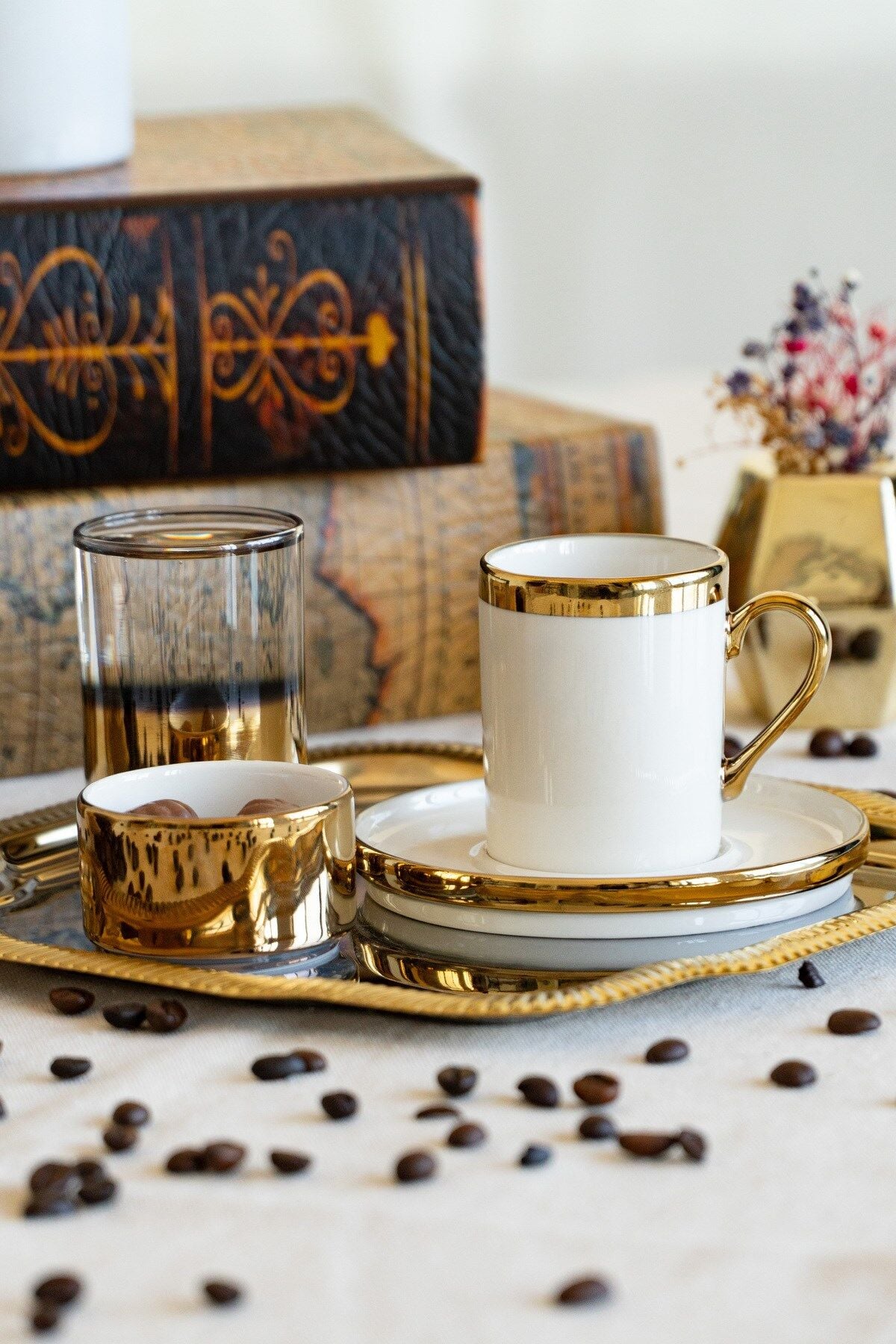 - Metal malzeme kullanımı sayesinde uzun ömürlü ve dayanıklı bir kullanım sunar.; - 5 parçadan oluşan set, kahve sunumunuzu tamamlayacak eksiksiz bir koleksiyon oluşturur.; - Altın rengi detaylarıyla şık ve zarif bir görünüm kazandırır, sofra düzeninize modern bir dokunuş ekler.; - 22 cm boyutundaki geniş yüzeyi ile rahatça servis yapmanızı sağlar ve konforlu bir kullanım sunar.; - Altın web rengi seçeneğiyle internet alışverişlerinizde kolayca bulabileceğiniz bir ürün olarak öne çıkar.; - Türkiye menşeli olmasıyla yerel üretim desteklenmiş olup, kalite ve güvenilirlik açısından tercih edilebilir.; - Altın yansımalı tepsisi, ışığı her açıdan zarifçe kırarak masanıza lüks bir dokunuş ekler.; Üzerinde yer alan beyaz porselen fincan, ince altın bordürüyle hem sade hem de göz alıcı bir duruş sergiler.; Fincanın yanında konumlandırılmış altın detaylı su bardağı, sunumun bütünlüğünü güçlendirirken modern bir kontrast yaratır.; Lokum ya da çikolata için tasarlanmış mini porselen kase ise setin tamamlayıcı incisi niteliğindedir.; Etrafına serpiştirilmiş kahve çekirdekleri, nostaljik kitap fonu ve altın objelerle zenginleştirilen kompozisyon, kahve keyfini sadece bir içecek olmaktan çıkarıp özel bir ritüele dönüştürür.; Gözde Sunum Seti, sadece bir sunum değil; her bakışta ışıltısını hissettiren, kahve keyfinizi bir üst seviyeye taşıyan özel bir tasarım parçasıdır.; ✨
