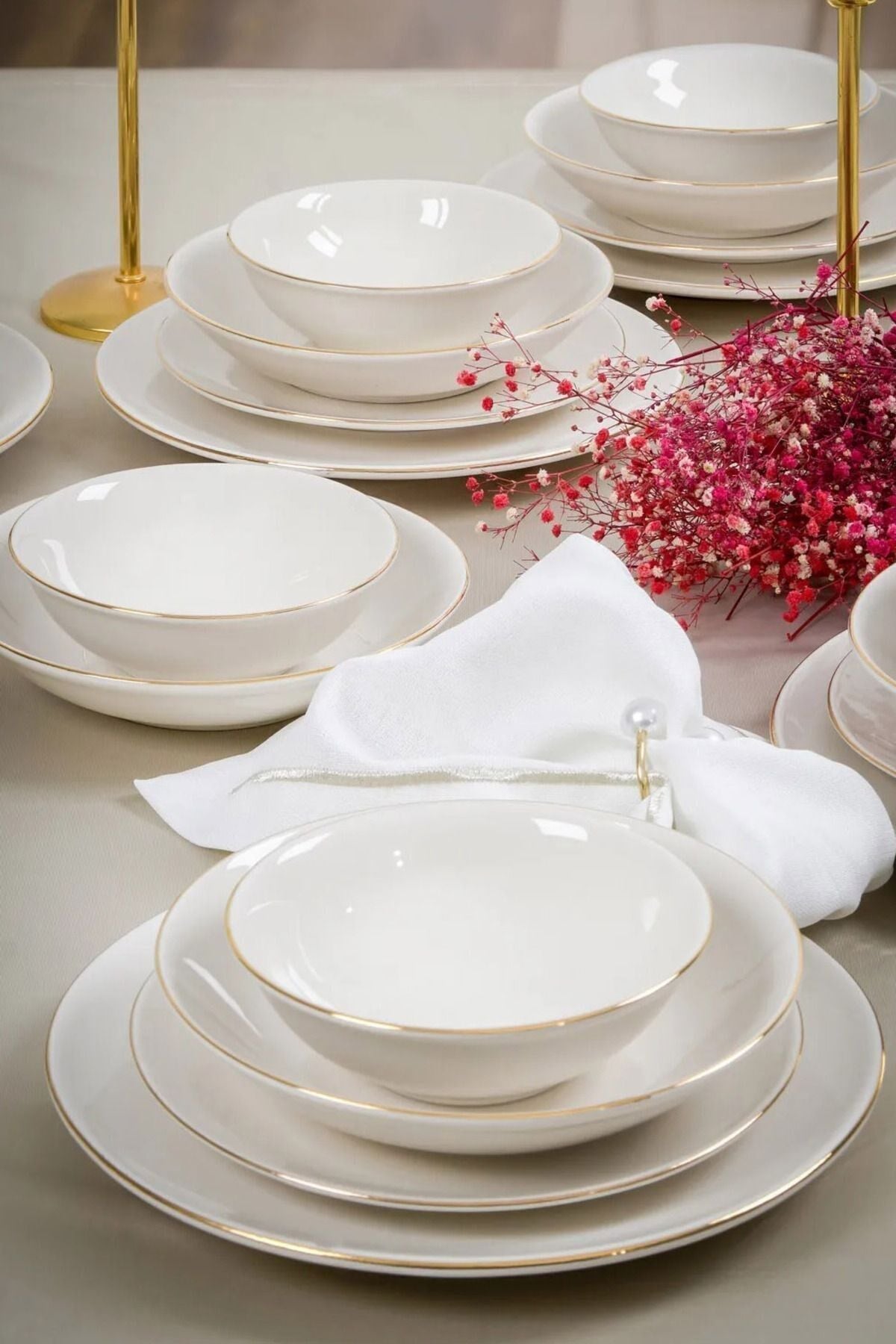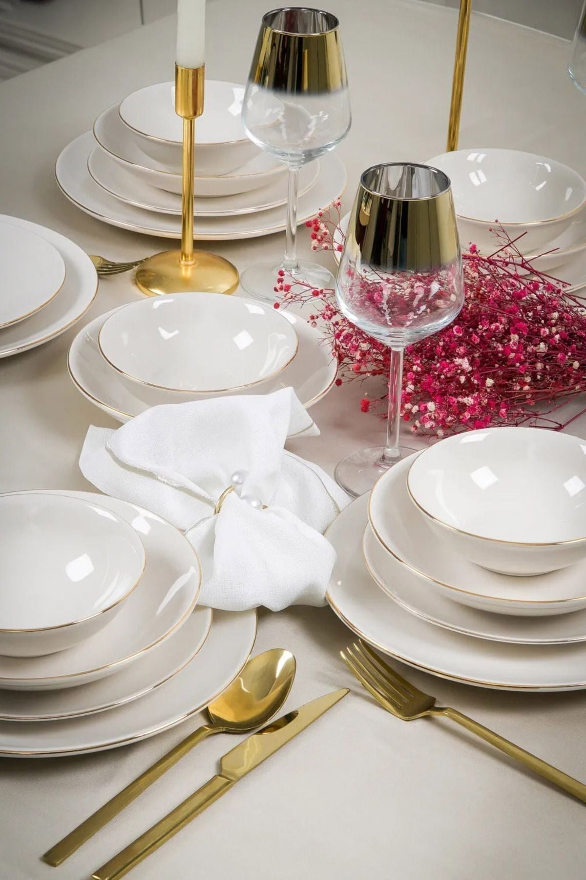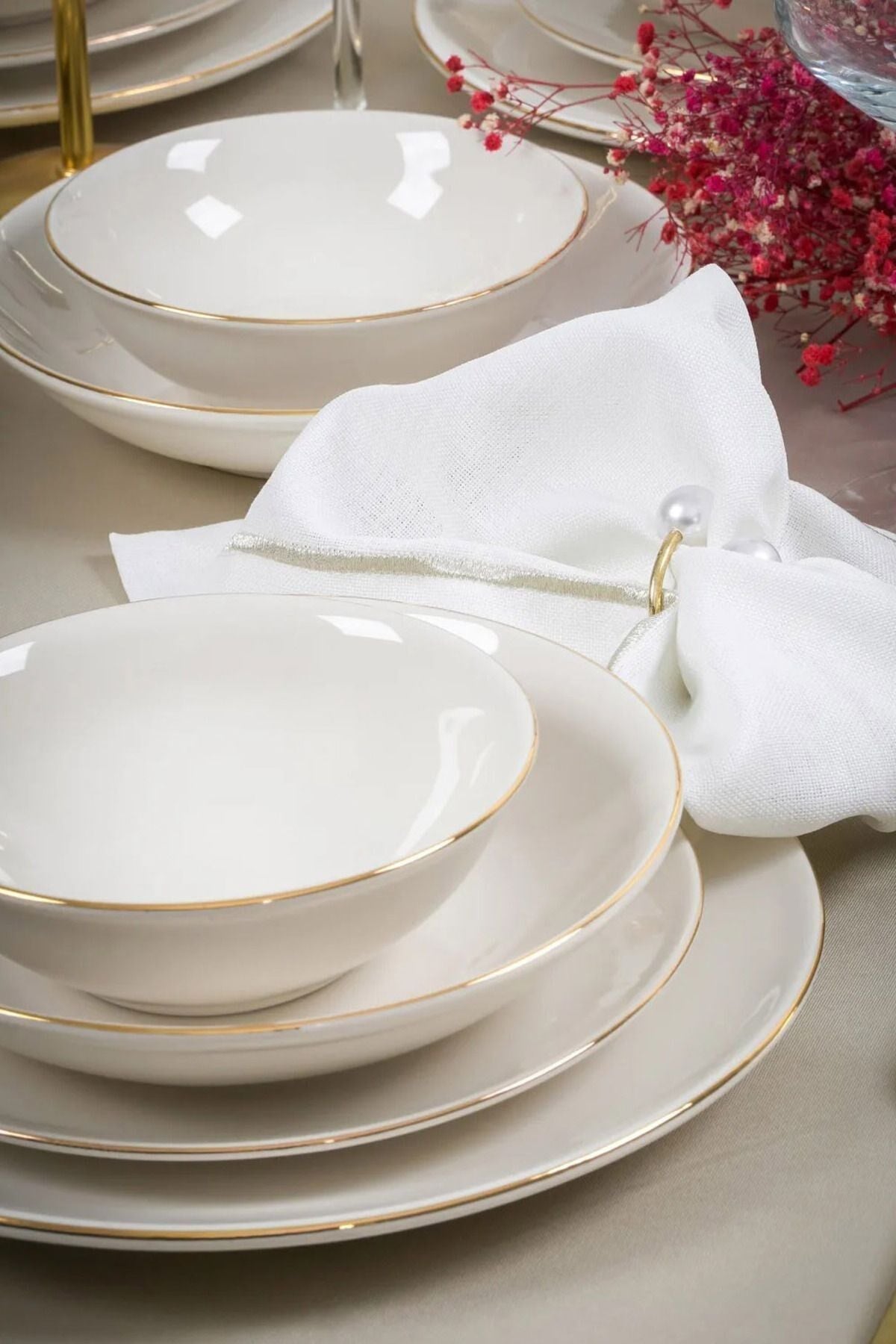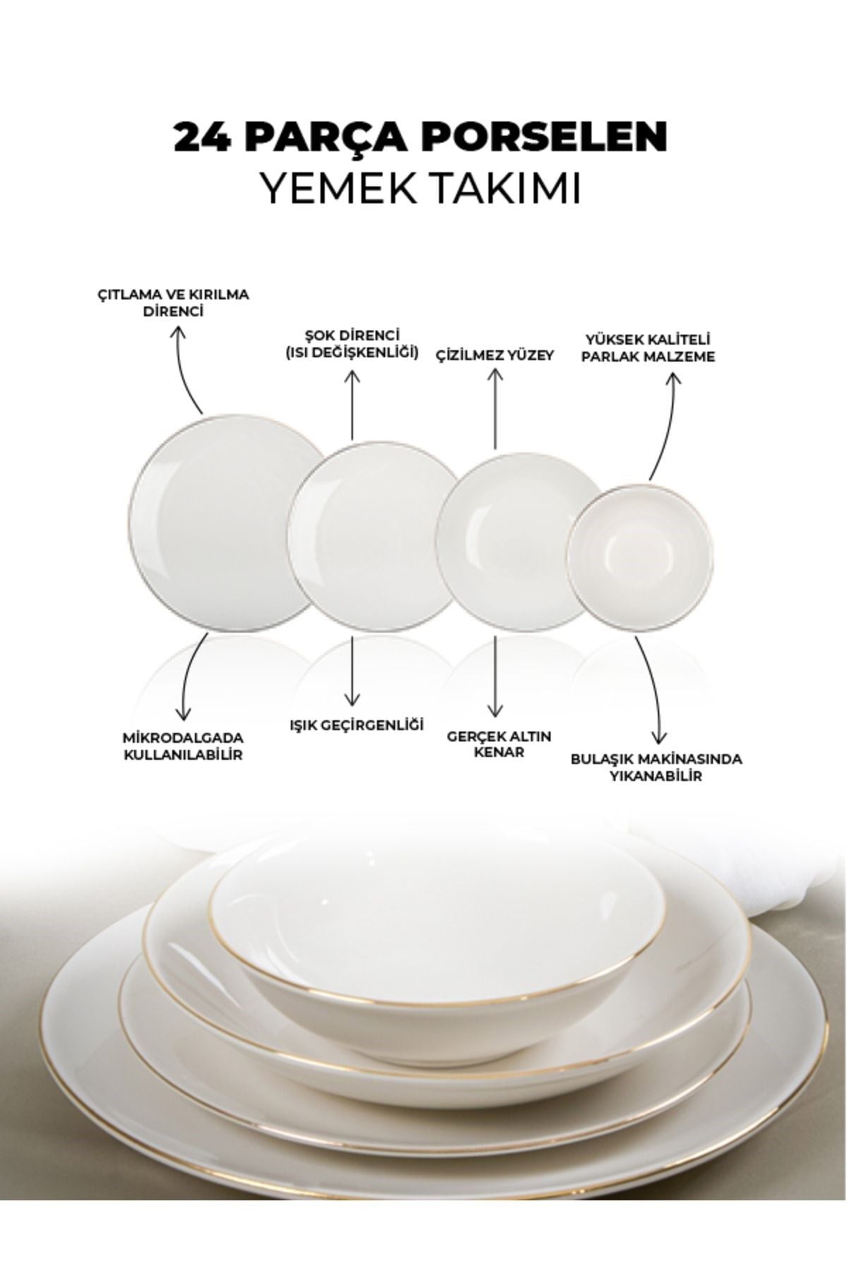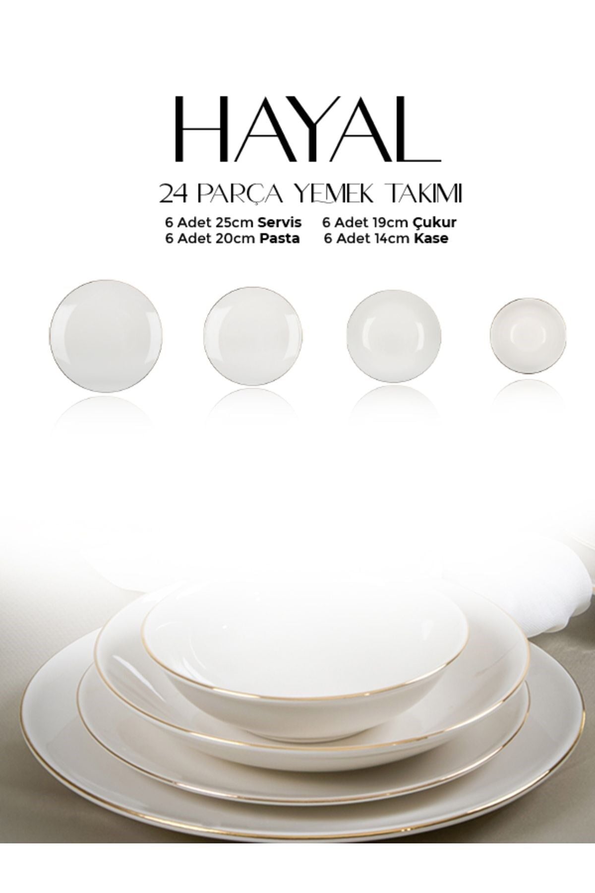 Altın yaldız detayları ile zenginleştirilmiş ve kırık beyaz rengiyle sofistike bir görünüm sunan Hayal Porselen Yemek Takımı, 6 kişilik geniş seti ile özel davetlerinizde şıklığı ve zarafeti masanıza taşır. ; Her parça, özenle tasarlanmıştır ve dayanıklı yapısı ile uzun süreli kullanım sunar. ; Porselen Rengi : Kırık Beyaz ; 6 Adet 25 cm Servis Tabağı ; 6 Adet 19 cm Çukur Tabak ; 6 Adet 20 cm Pasta Tabağı ; 6 Adet 14 cm Kase ; Siparişleriniz, strafor ve özel kutular kullanılarak özenle paketlenip gönderilmektedir. ;
