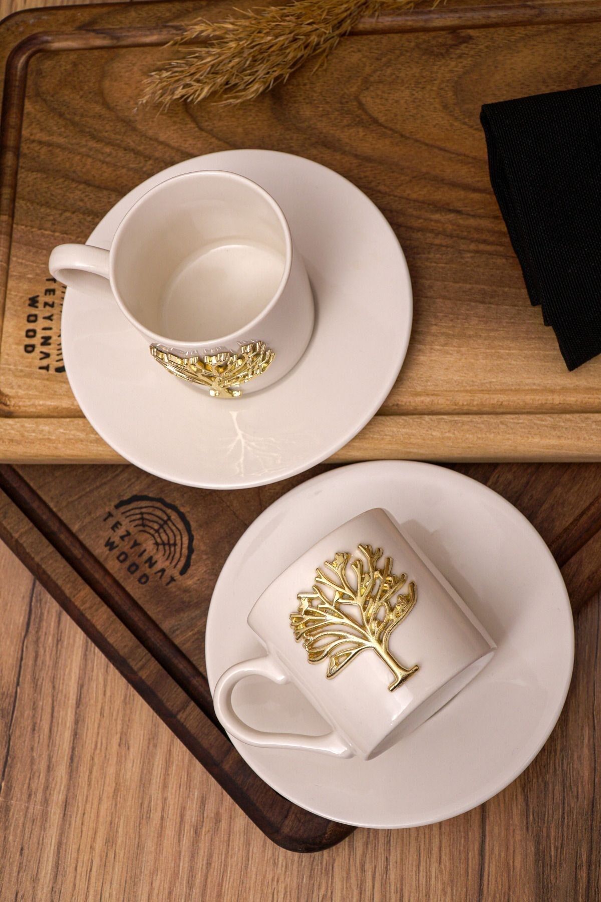 Hayat Ağacı Altın Kabartma Motif 4 Parça 2 Kişilik Kahve Fincan Takımı 100 Ml