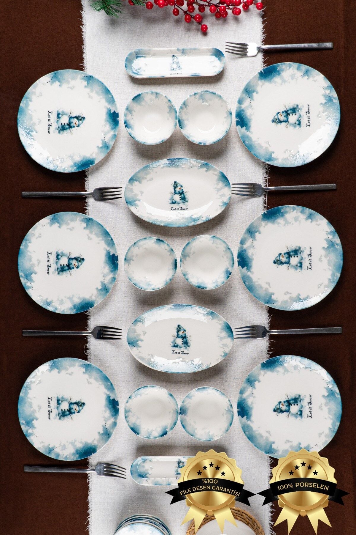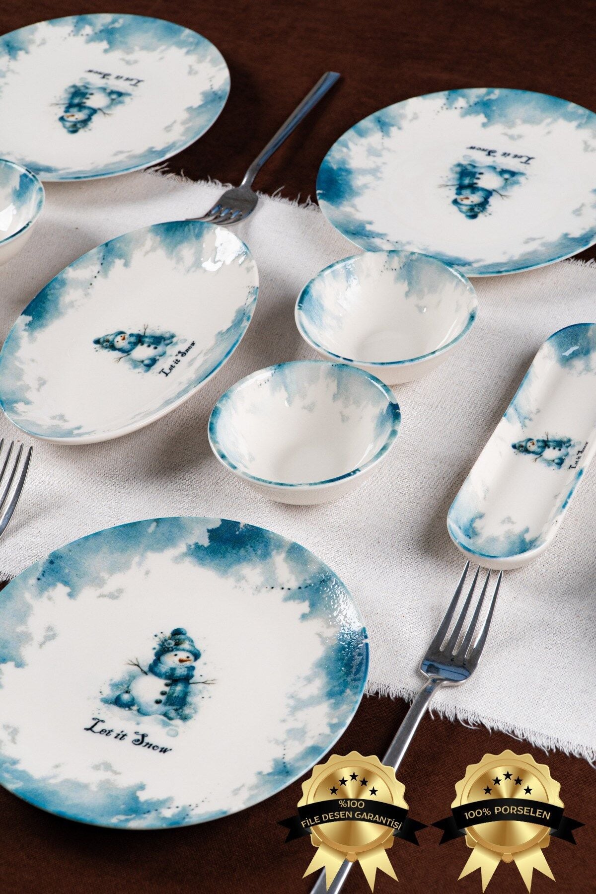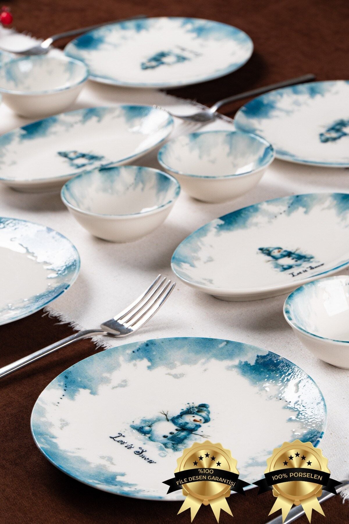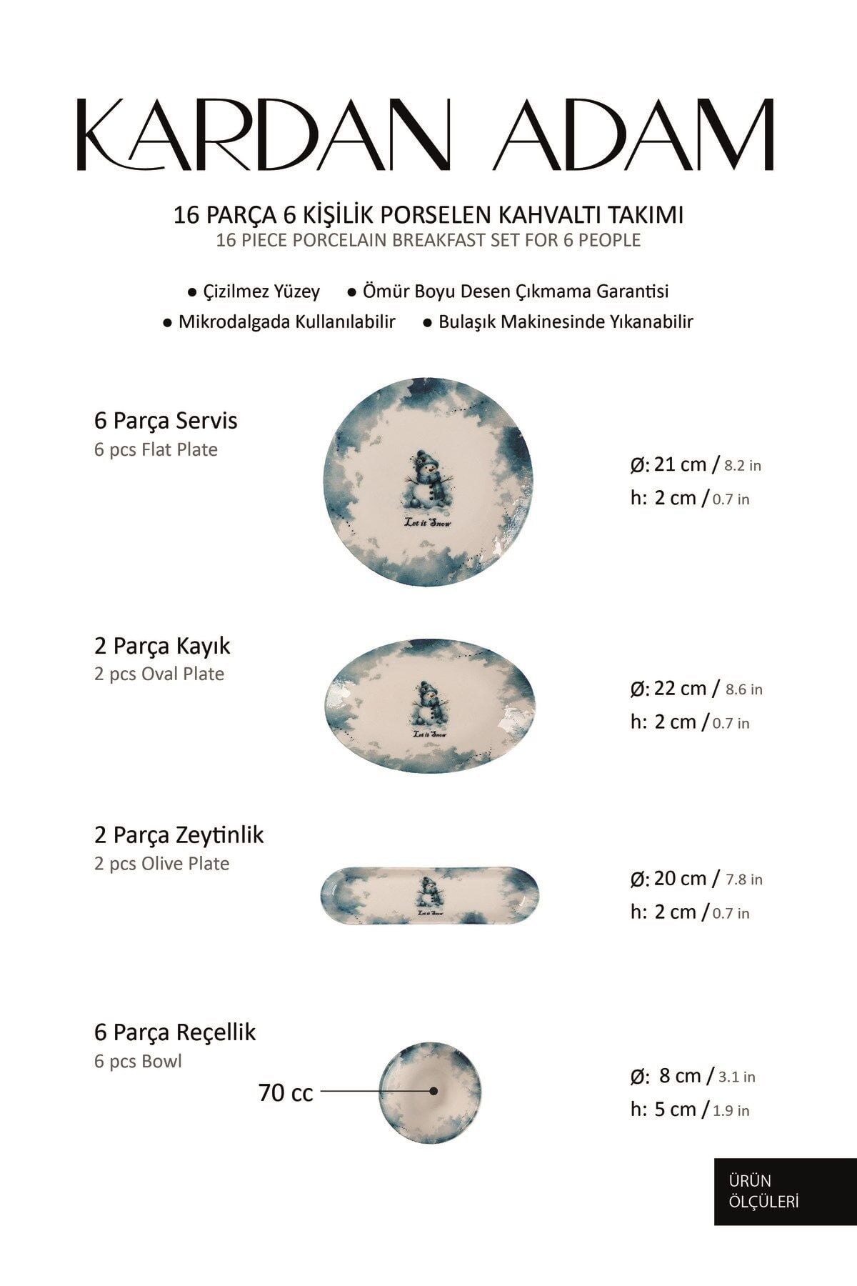 - 6 kişilik geniş kapasitesiyle aile ve arkadaş toplantılarınızda ideal bir seçimdir.; - Porselen malzemesi sayesinde uzun ömürlü kullanım ve şık bir görünüm sunar.; - Mikrodalgada güvenle kullanabileceğiniz özelliği ile pratiklik ve kolaylık sağlar.; - Modern tasarımıyla mutfak dekorasyonunuza çağdaş bir dokunuş ekler.; - Beyaz rengi ve yuvarlak şekliyle klasik ve zamansız bir estetik sergiler.; - 16 parçadan oluşan set, kahvaltı sofralarınız için gerekli tüm eşyaları içerir.; - Kardan Adam Kahvaltı Takımı, sabah sofralarına neşe ve masum bir mutluluk katmak için tasarlandı.; Mavi-beyaz tonların verdiği ferahlık, sevimli kardan adam deseniyle birleşerek özellikle kış sabahlarını ve keyifli kahvaltı anlarını daha da özel hale getirir.; Her parçası bakıldığında iç ısıtan bu takım, çocuklu aile sofralarından hafta sonu kahvaltılarına kadar herkesi gülümseten bir atmosfer oluşturur.; Sade ama karakterli duruşuyla hem göze hitap eder hem de sofrada samimi bir hikâye anlatır.; Kahvaltıyı sadece bir öğün değil, keyifli bir anıya dönüştürmek isteyenler için sıcacık bir seçimdir.; ❄️☕