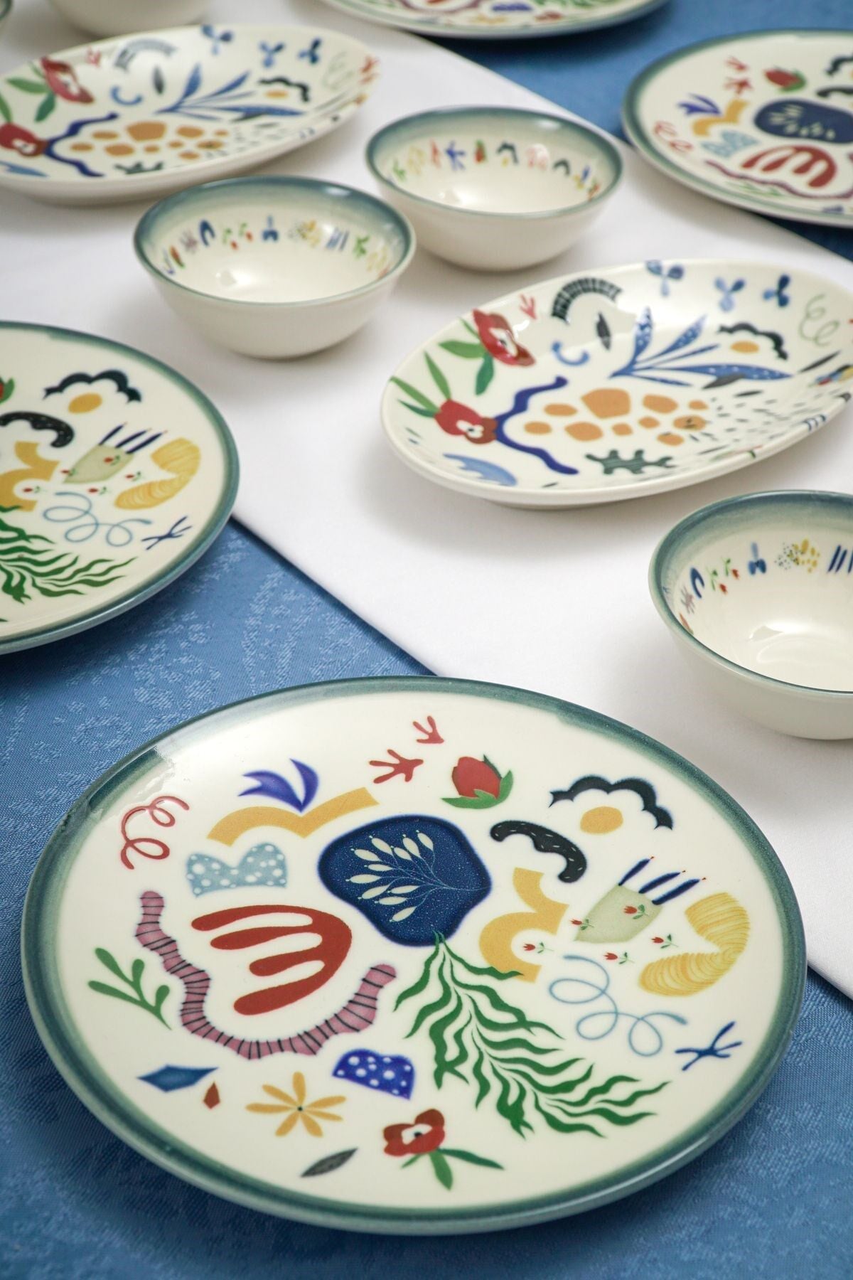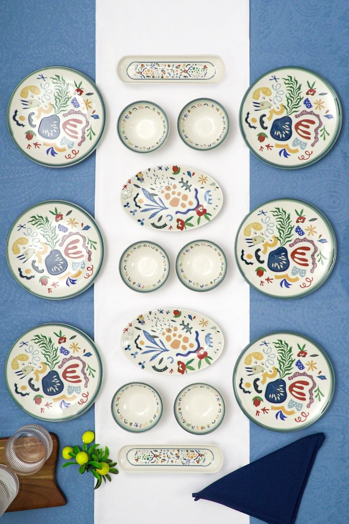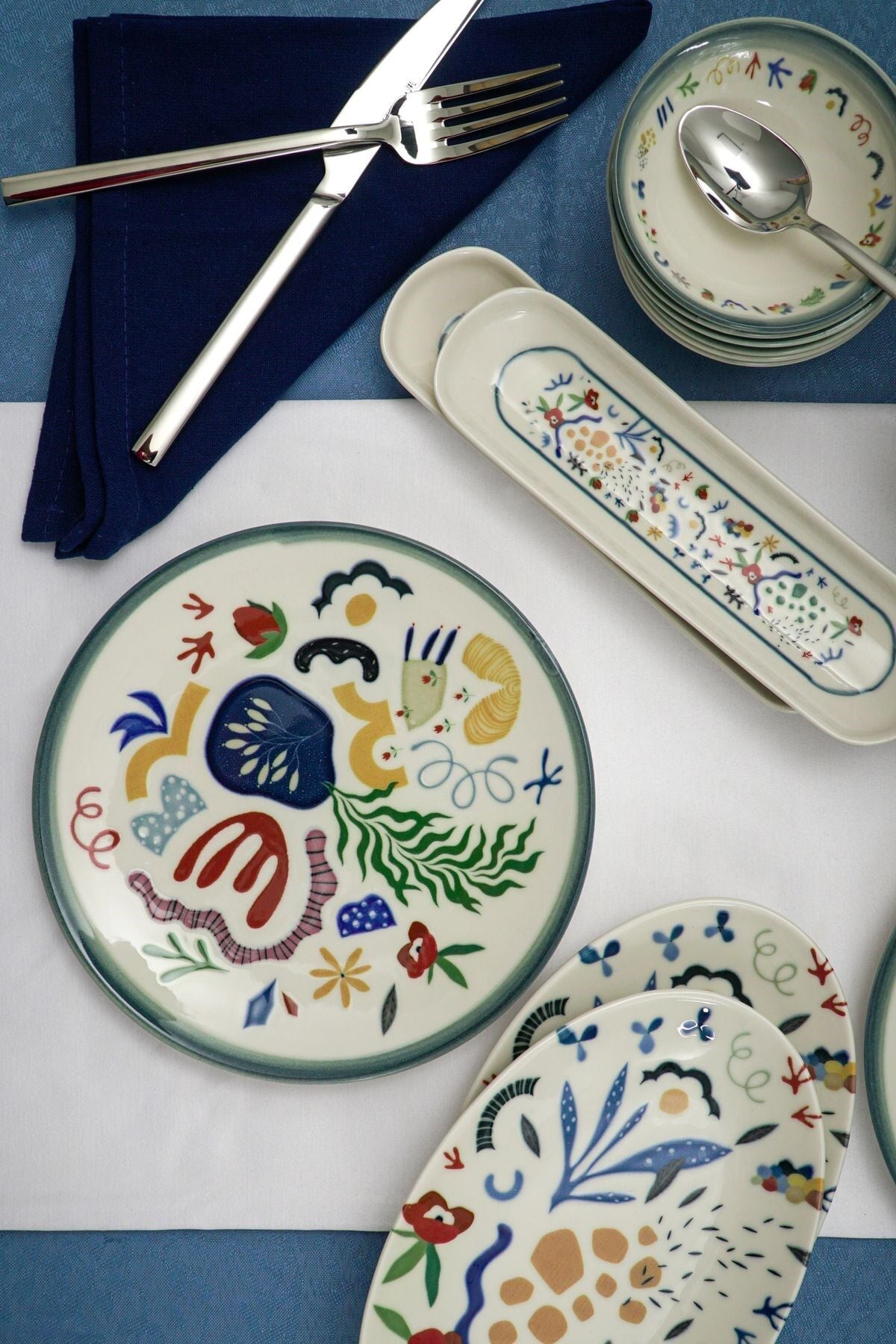 Neşeli ve renkli tasarımıyla dikkat çeken bu kahvaltı takımı, 6 kişilik kullanım için idealdir. Her bir takım, 6 adet kahvaltı tabağı ve 6 adet kahve fincanı ile 4 adet kahve tabağından oluşur. Günlük kahvaltı keyfinizi renklendirmek ve sofralarınıza neşe katmak için mükemmel bir seçimdir. ; Porselen Rengi : Kırık Beyaz ; 6 Adet 20 cm Servis Tabağı ; 6 Adet 10 cm Reçellik ; 2 Adet Kayık Tabak (20x13 cm) ; 2 Adet 20 cm Zeytinlik ;