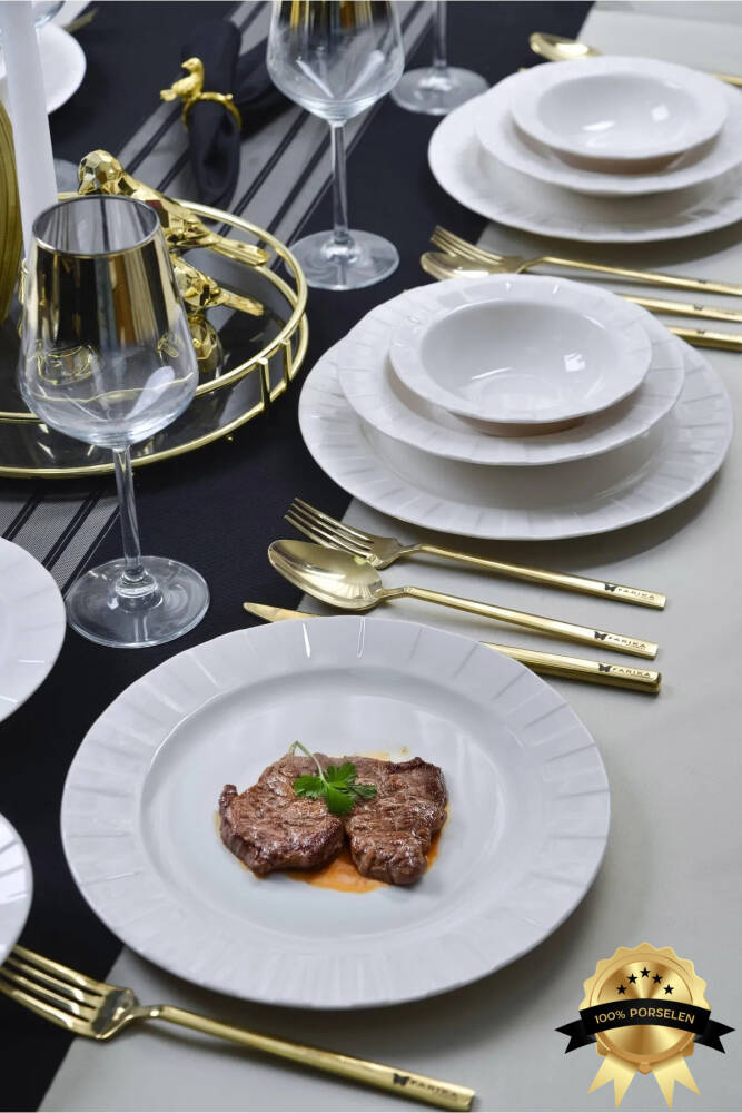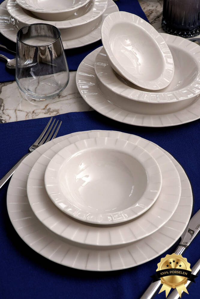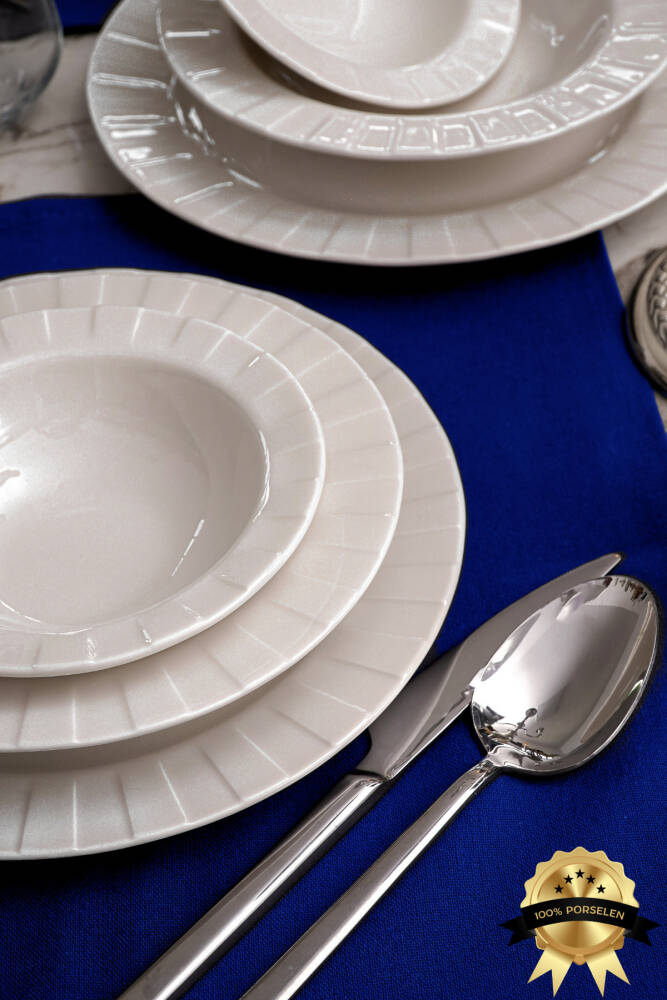 Sofranızda zarafetin ve şıklığın sembolü olacak Zümrüt 18 Parça 6 Kişilik Porselen Yemek Takımı, her detayında kalitesini hissettirir.; ; Modern ve sofistike tasarımı ile dikkat çeken bu set, özel davetlerden günlük kullanıma kadar her anınıza eşlik edecek.; ; 6 adet servis tabağı ; 6 adet yemek tabağı ; 6 adet kaseden oluşan bu takım, misafirlerinizi etkileyici sunumlarla ağırlamanız için mükemmel bir seçimdir.; ; Yüksek kaliteli porselen malzemesi ve özenli işçiliği ile uzun yıllar kullanım imkanı sunar.; Zümrüt yemek takımı ile sofralarınıza hem estetik bir dokunuş katın hem de sevdiklerinizle paylaştığınız anları unutulmaz kılın.; Porselen Rengi : Kırık Beyaz 6 Adet 25 cm Servis Tabağı 6 Adet 19 cm Çukur Tabak 6 Adet 14 cm Kase.; Siparişleriniz, strafor ve özel kutular kullanılarak özenle paketlenip gönderilmektedir.; ;